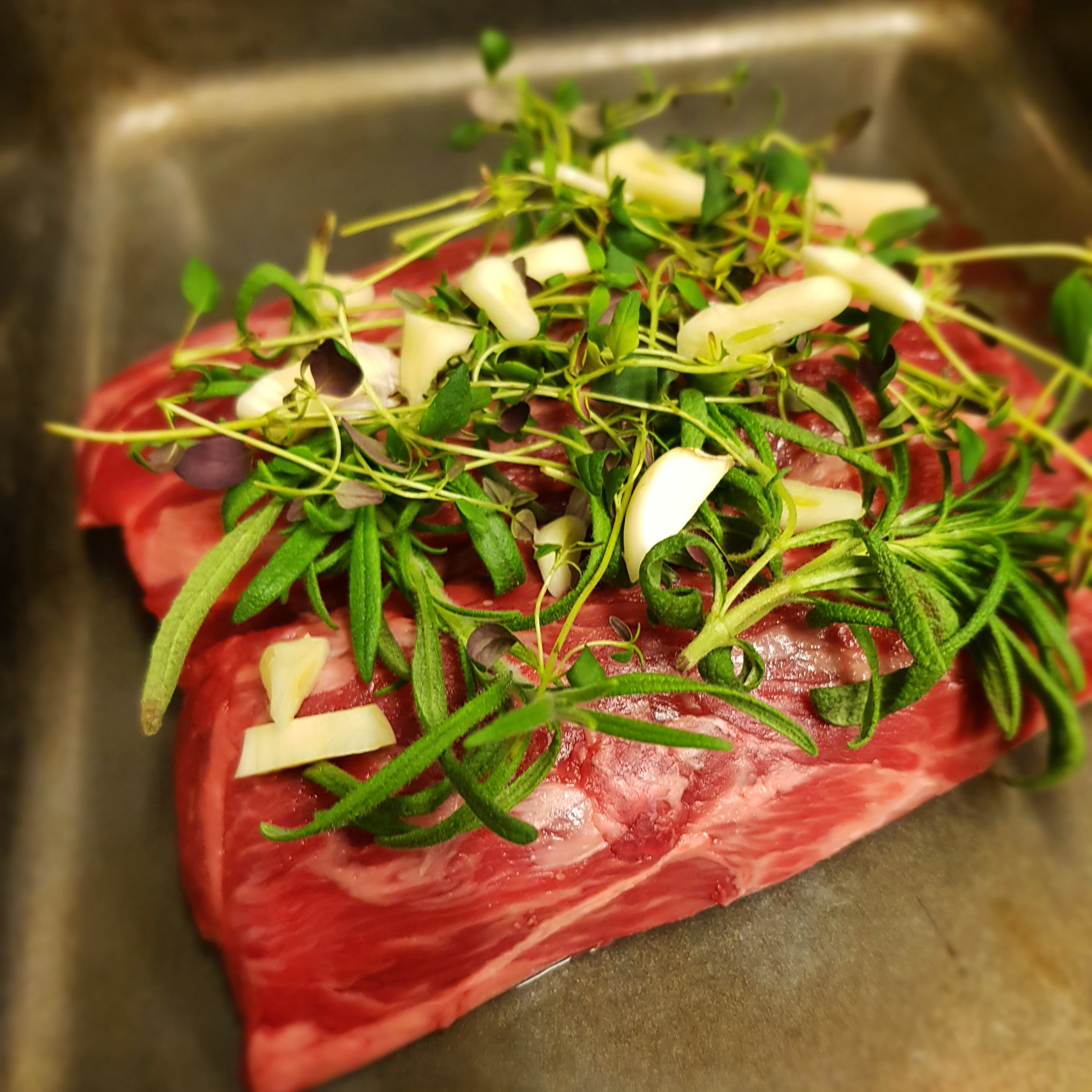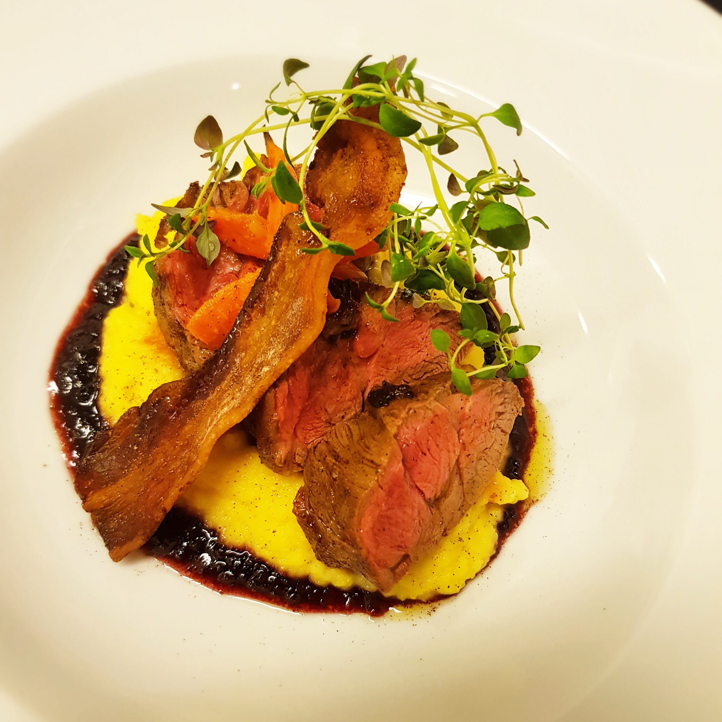 Det blev lammentrécote på menyn för mina kollegor. Till detta serverade jag en kålrotspure som har fått kokat i smör och salt. Häll ut lite av vätskan och pressa ner med varmgrädde och salt. Mixa med äppelcidervinäger, dragon, salt, vitpeppar och en klick smör. Smaka av. Pancetta i ugn tillsammans med vitlök. Rödvinsås som kokas upp och reduceras ner. Ugnsrosta morrötter och pickla in. Innan servering toppa med timjan och lite peppar.
