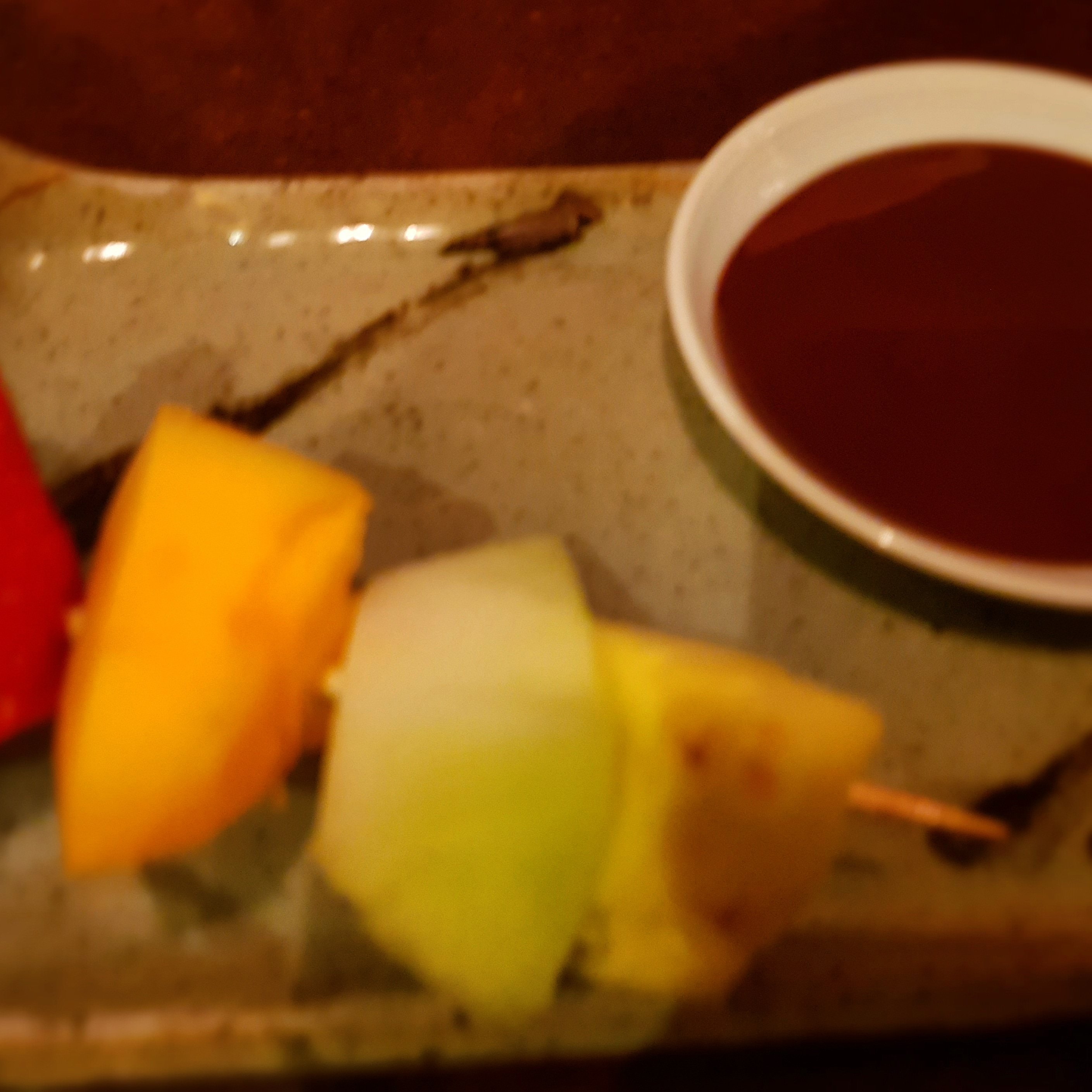 Oftats är mitt sällskap väldigt kär i sötsaker men en blir så otroligt mätt så här fick hen i sig ett fruktspett med smält choklad. Lite sött efter maten stabiliseras.