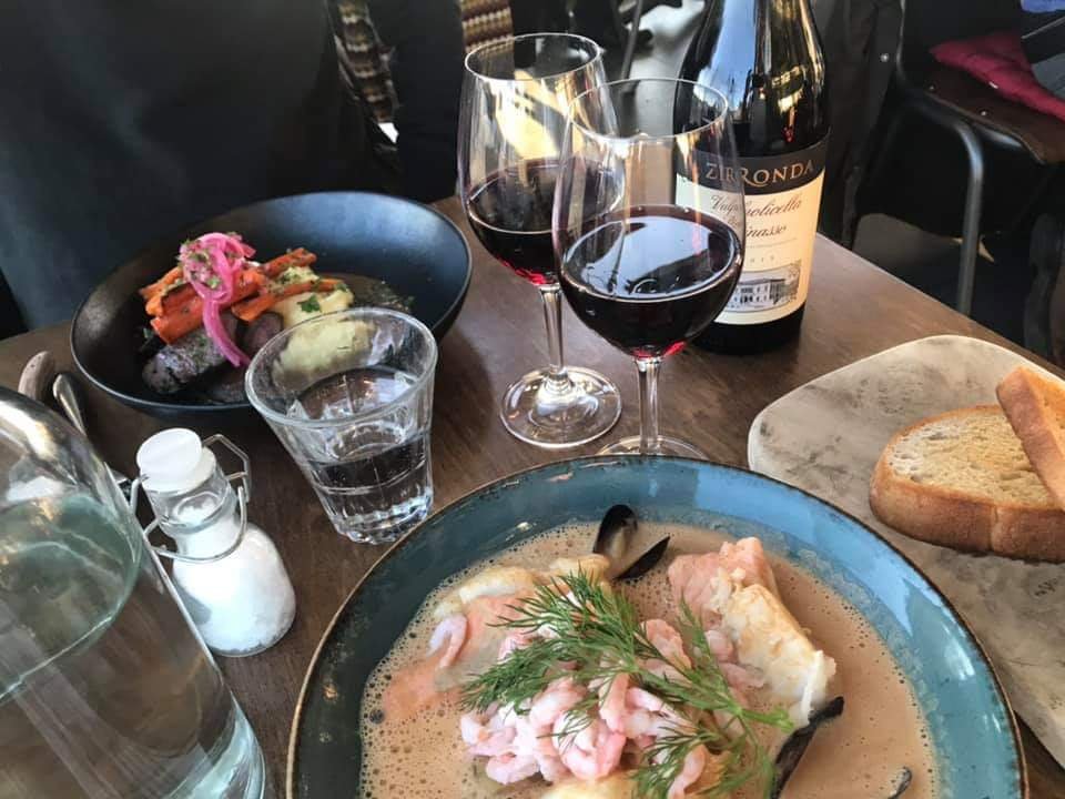 Mitt sällskap åt Batteriets efterlängtade fisk- & skaldjursgryta på lax, torsk, räkor, musslor som serveras med aioli och perfekt bröd apart.