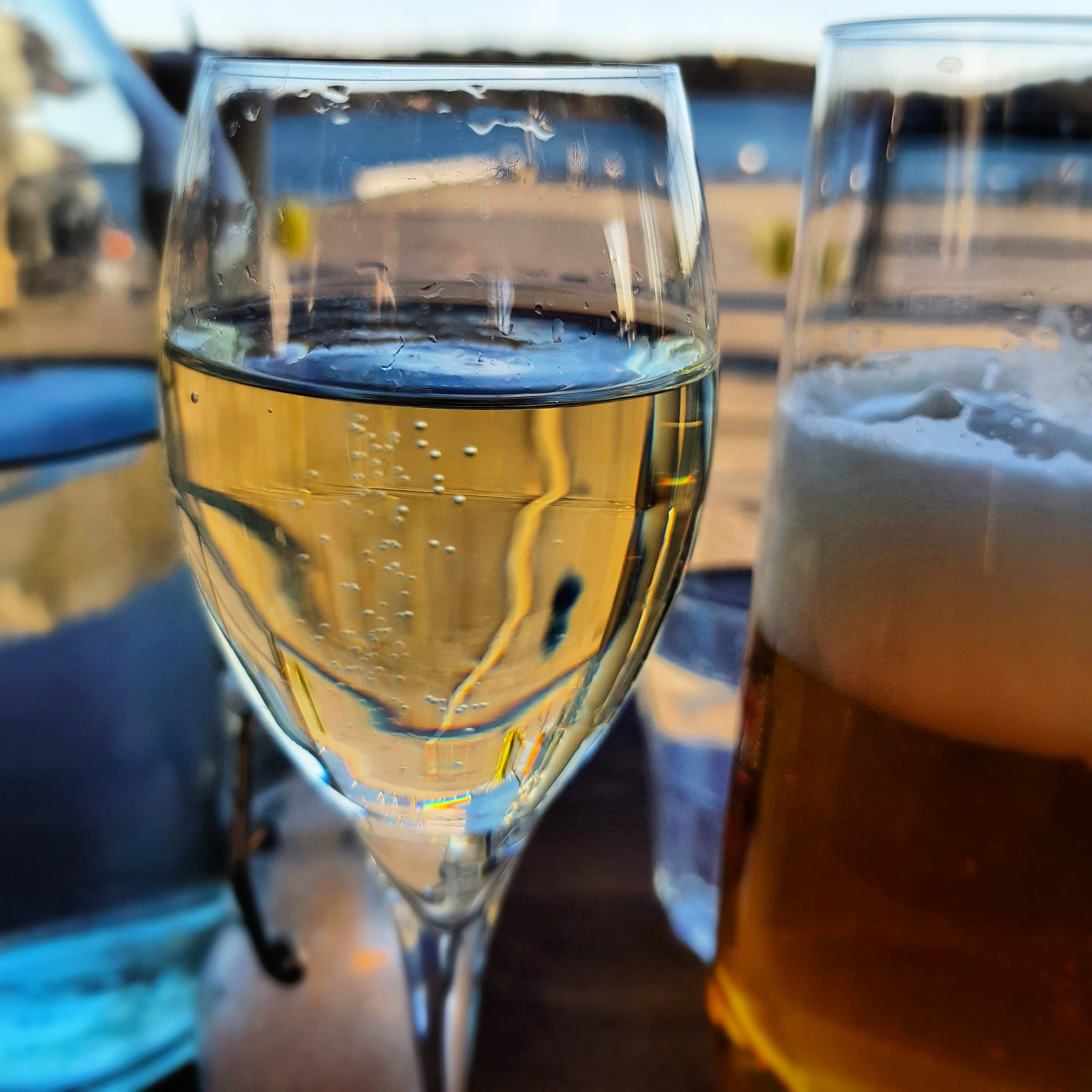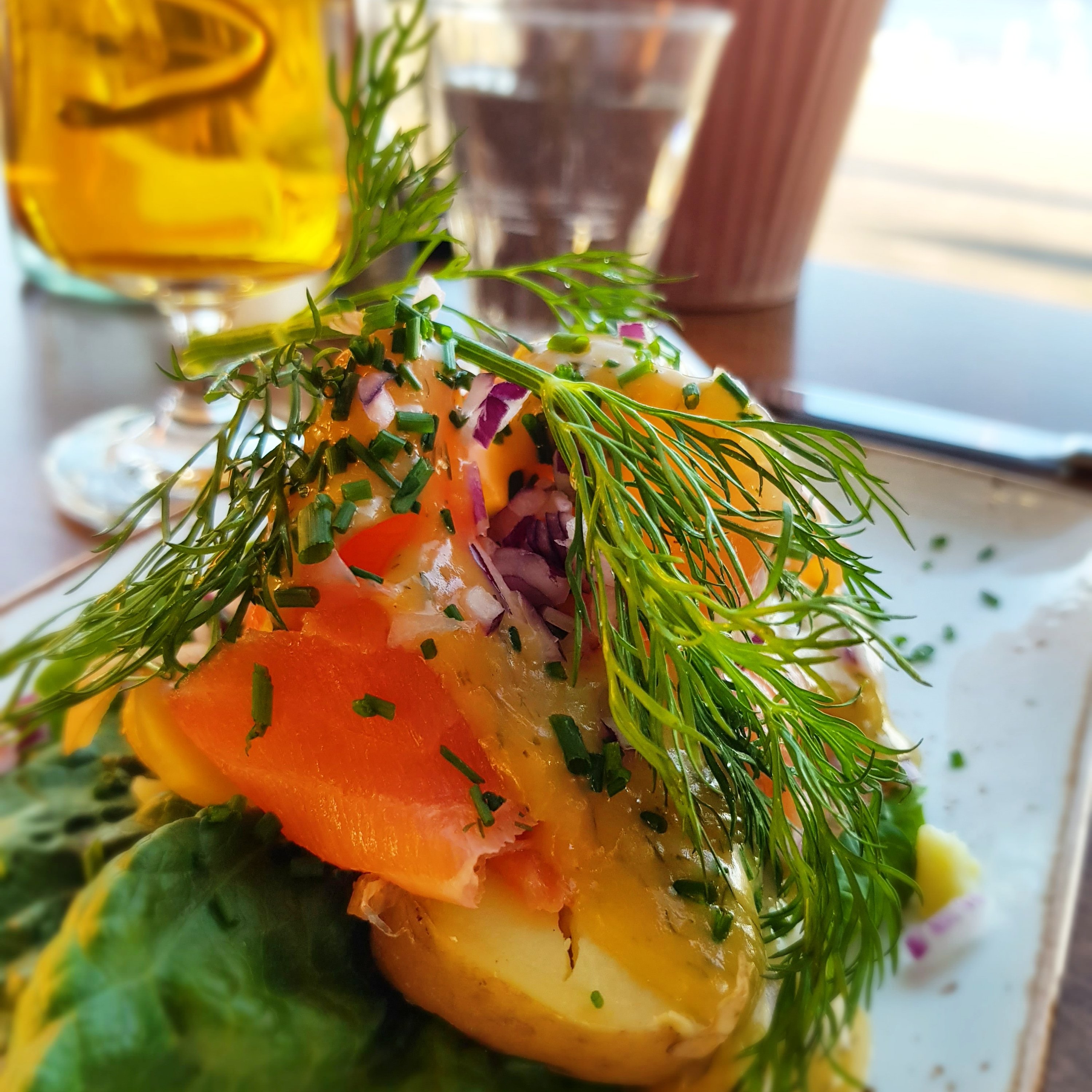 Gravlaxtoast på grillat bröd, perfekta potatishalvor och den godaste såsen jag har ätit ute på en förrätt tillsammans med en glutenfri San miguel.