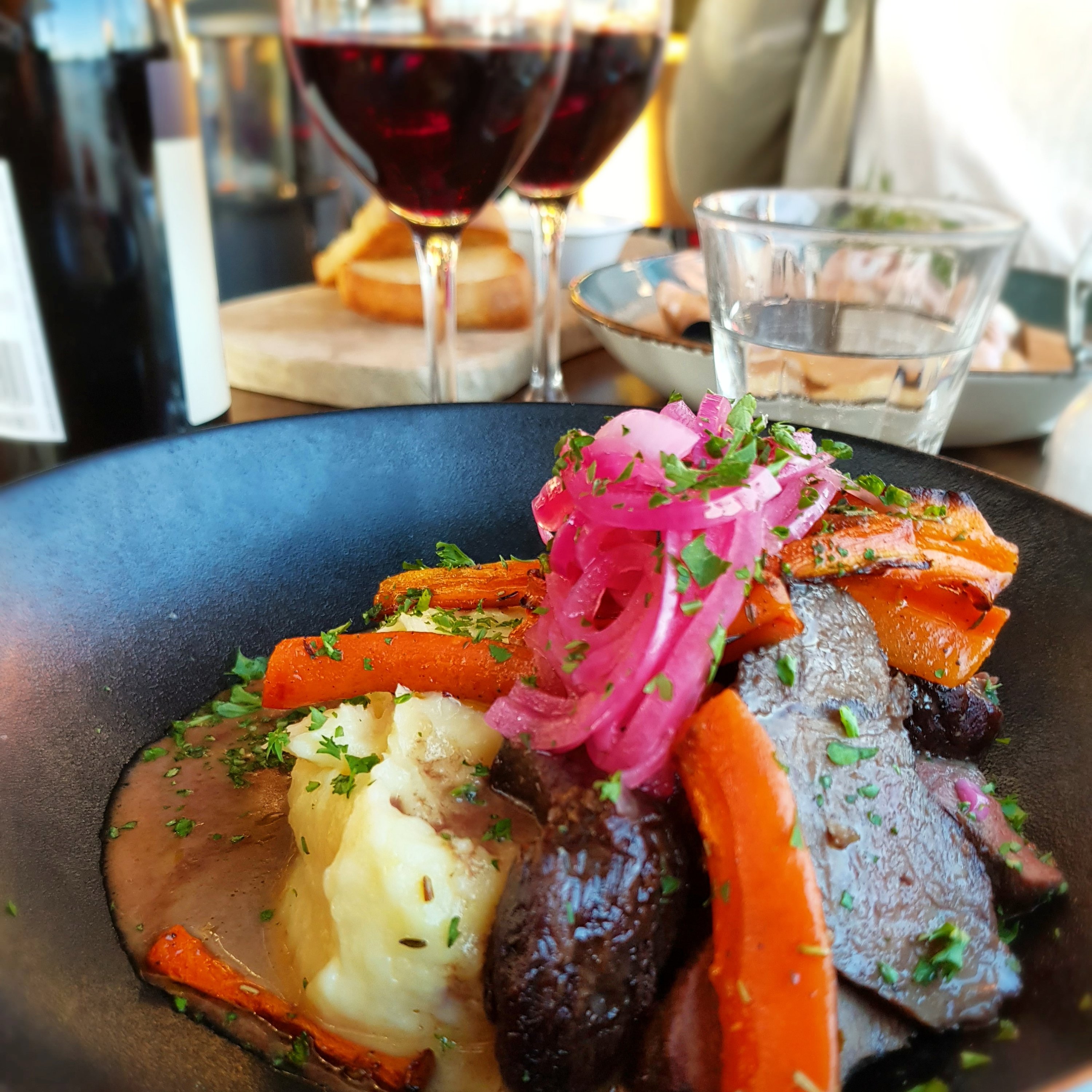 Hjortfile med potatispure, smörglaserade morröter, picklad rödlök och en fantatiskt god sky.