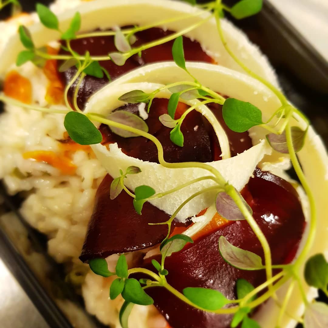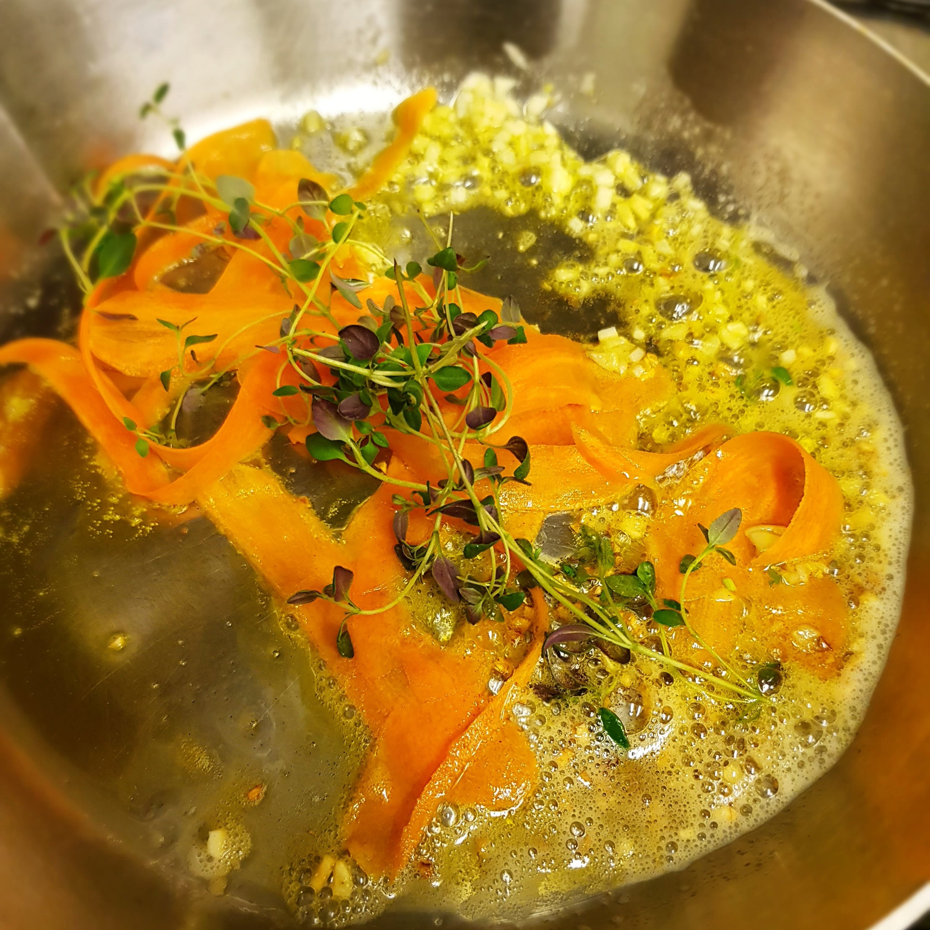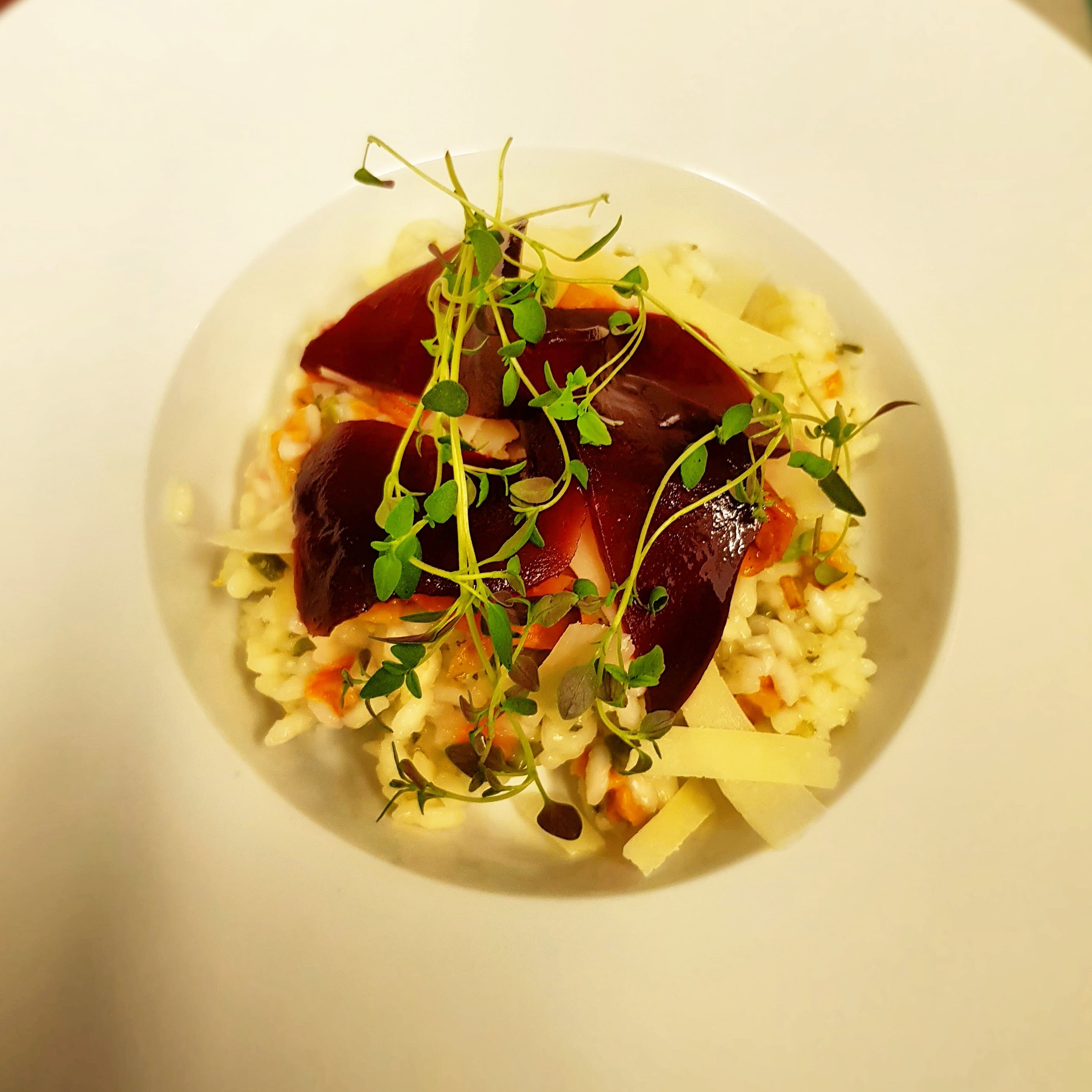 Idag svängde jag ihop en risotto med sparris och morrötter som fick koka i en Karl Johan svampfond och sjuda under omrörning. Till detta hyvlade jag morröter som har stekts i bryntsmör, salt, vitlök, och timjan. Jag marinerade in rödbetor tillsammans med rosébalsamico, lite sötma, salt, vitpeppar och egentligen ska det rivas över lite rosépeppar. På toppen av serveringen hyvlar vi över grandpandano blad och toppar med färsk timjan.