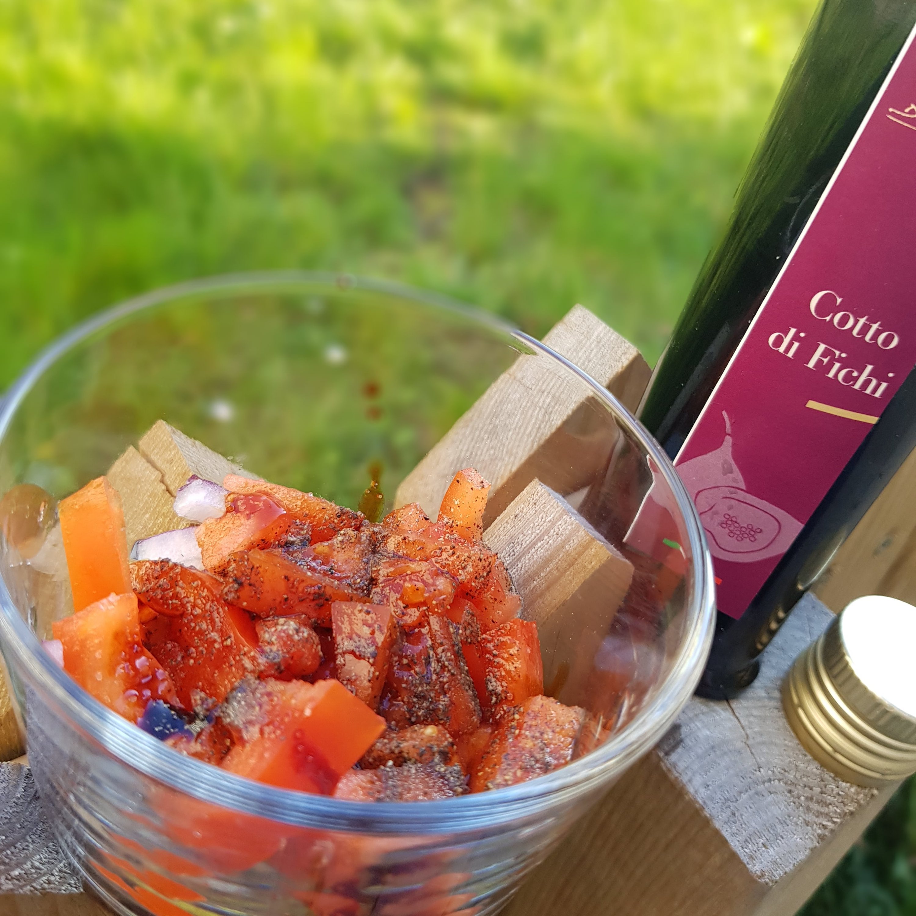 Till detta serverades tomat från San Marino som blandades med rödlök och som blandades med Cotto di Fichi, olivolja, salt och svartpeppar. På sidan om ligger vitsparris som är brynt i smör och salt. Ringla över en hollandaise. (En kock är också bara en människa så blanda ihop en klick majonnäs från burken, några skvätter vitvinsvinäger, dragon och peppar. Ta gärna en matsked av det brynta smöret och vispa ner.