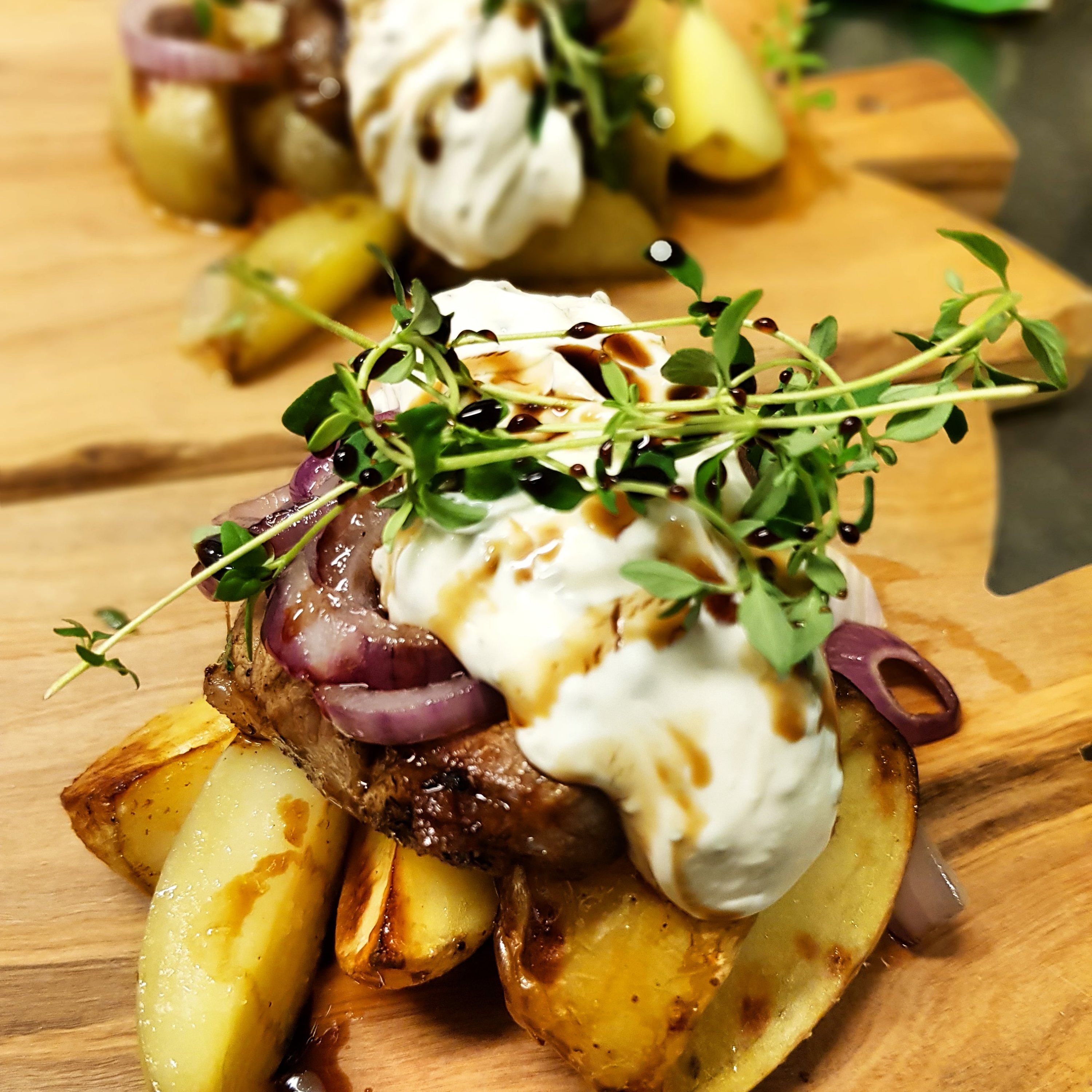 Smörstekt bresloa med timjan och vitlök tillsammans med klyftpotatis, karamelliserad rödlök och dragonmayo.