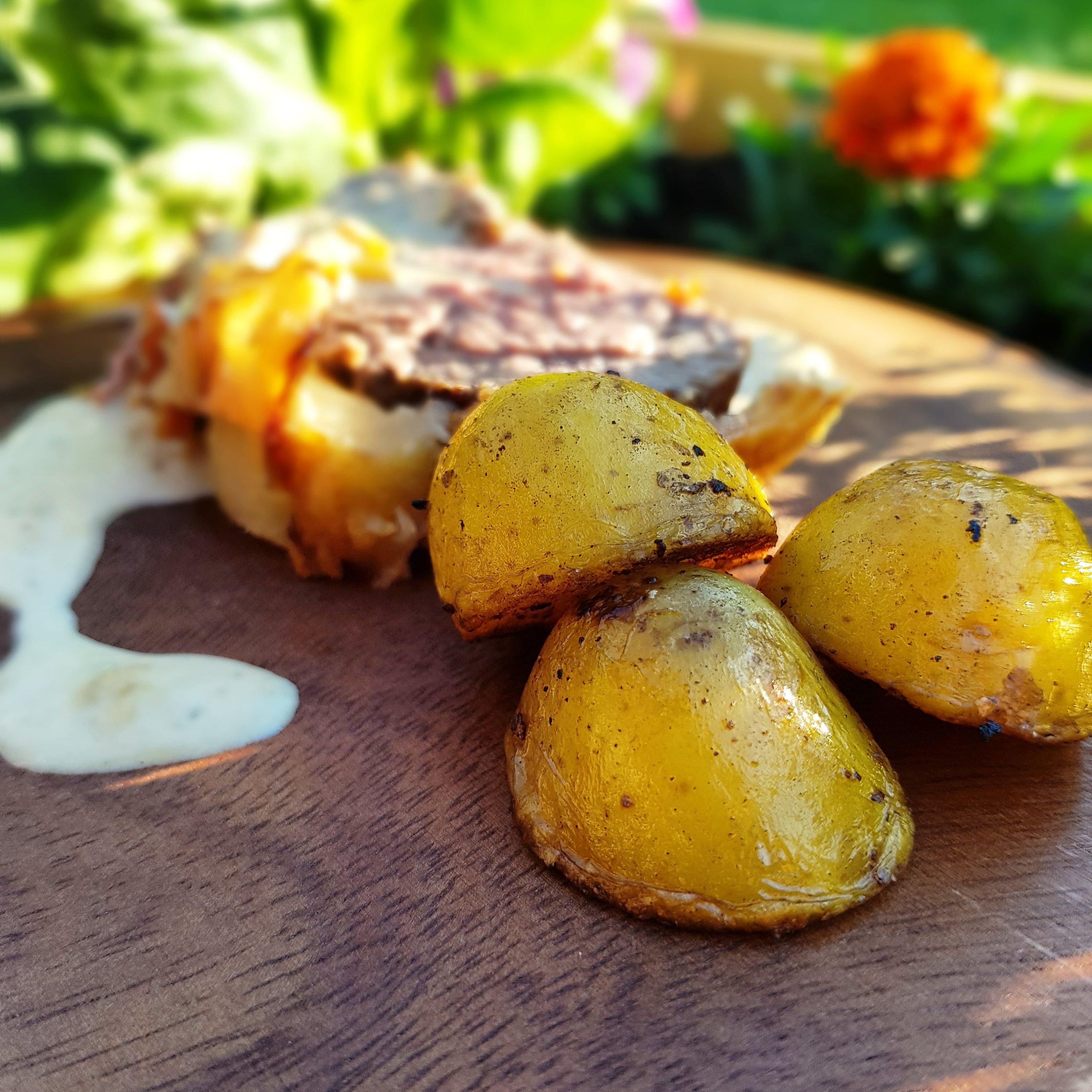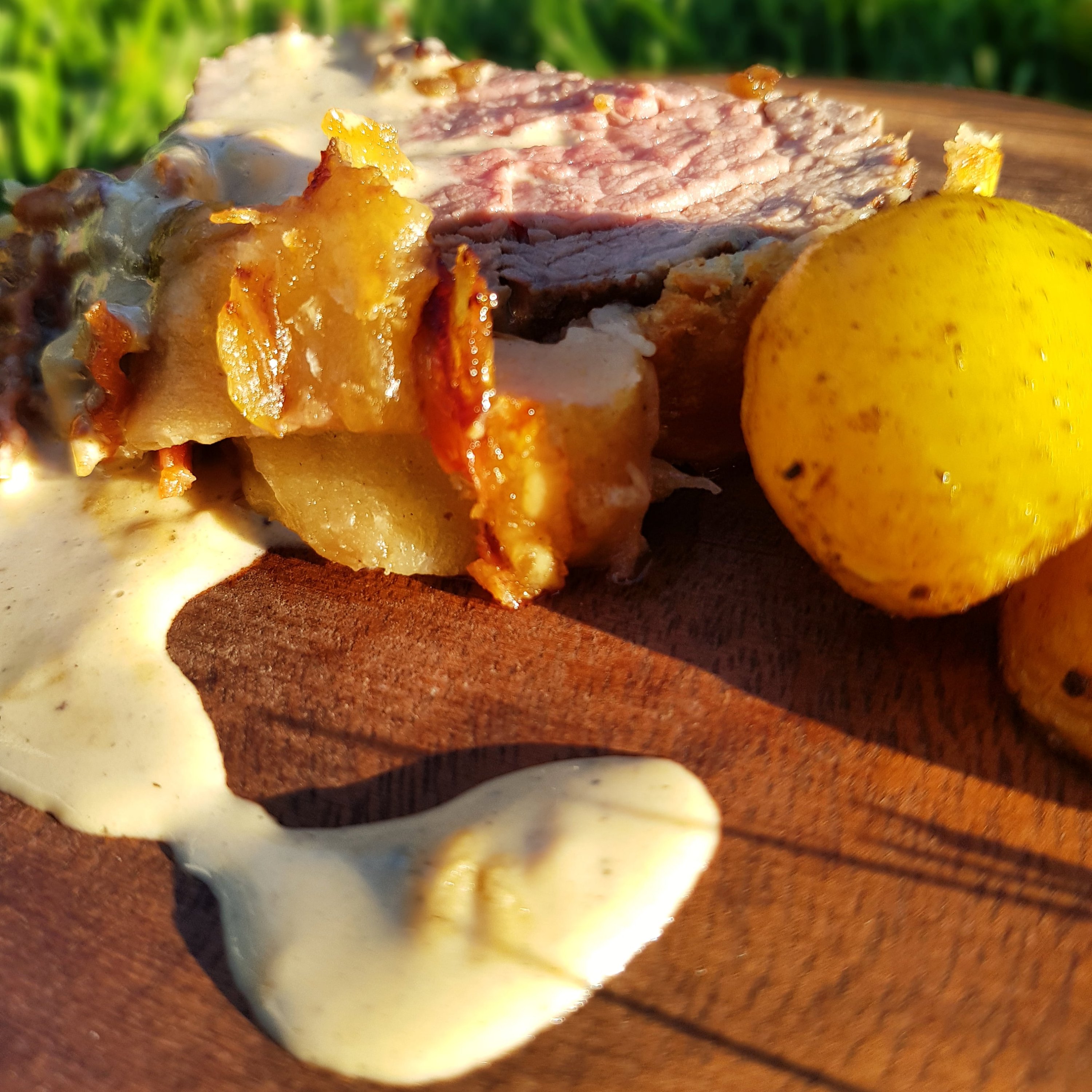 Ibland är det fördel att vara kock i familjen när alla råvaror och ingredienser ligger framdukad. Kvällen till ära blev beef wellington fylld med lök och parmachips tillsammans med en oxfondsås och smörslungade potatishalvor med flingsalt.