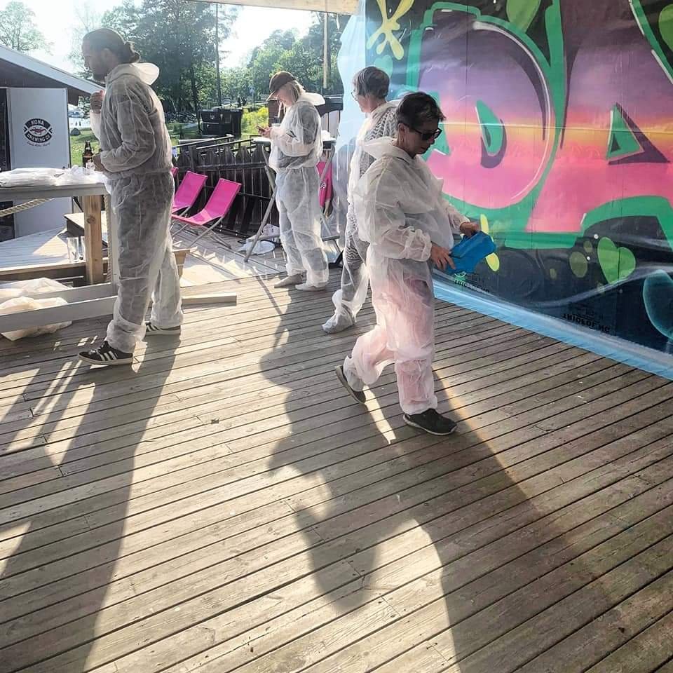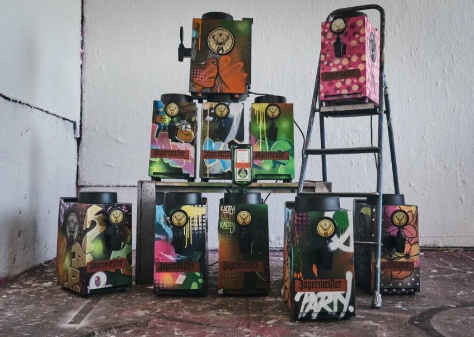 – Vi målar på allt och tyckte att det var en särskilt kul utmaning att få göra vår egen tolkning av Jägermeisters värld på tio Tap Machines. Vi har använt alla våra tekniker med spray, penna och pensel och utgått från den ultimata festen, där alla är bjudna och där struktur möter kaos. Alla är där och representeras med skratt, kärlek och allvar, säger Klive och Kaos på Graffitisthlm.
