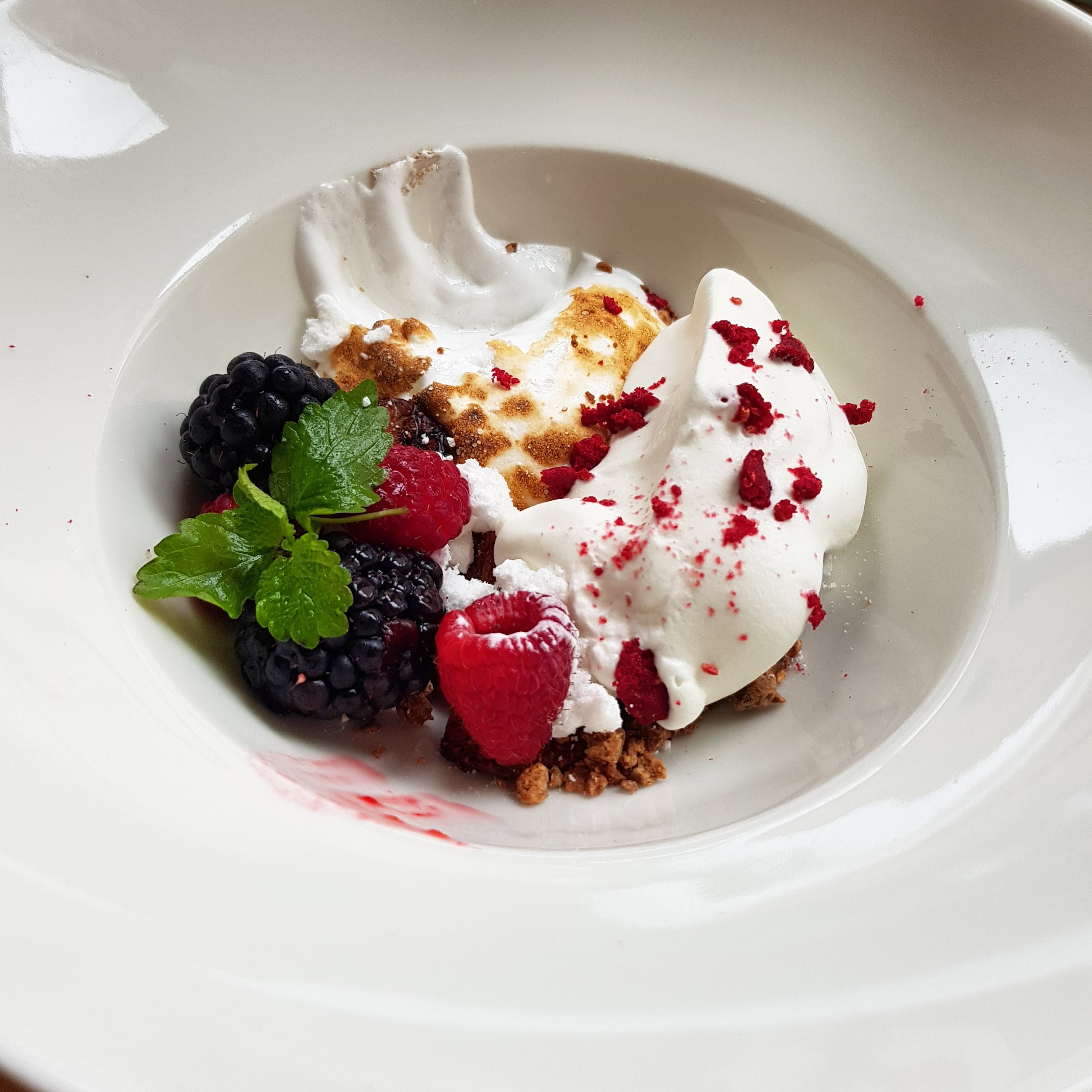 En enklare efterrätt med torkade jordgubbar, färska bär, kökets maräng och grädde.