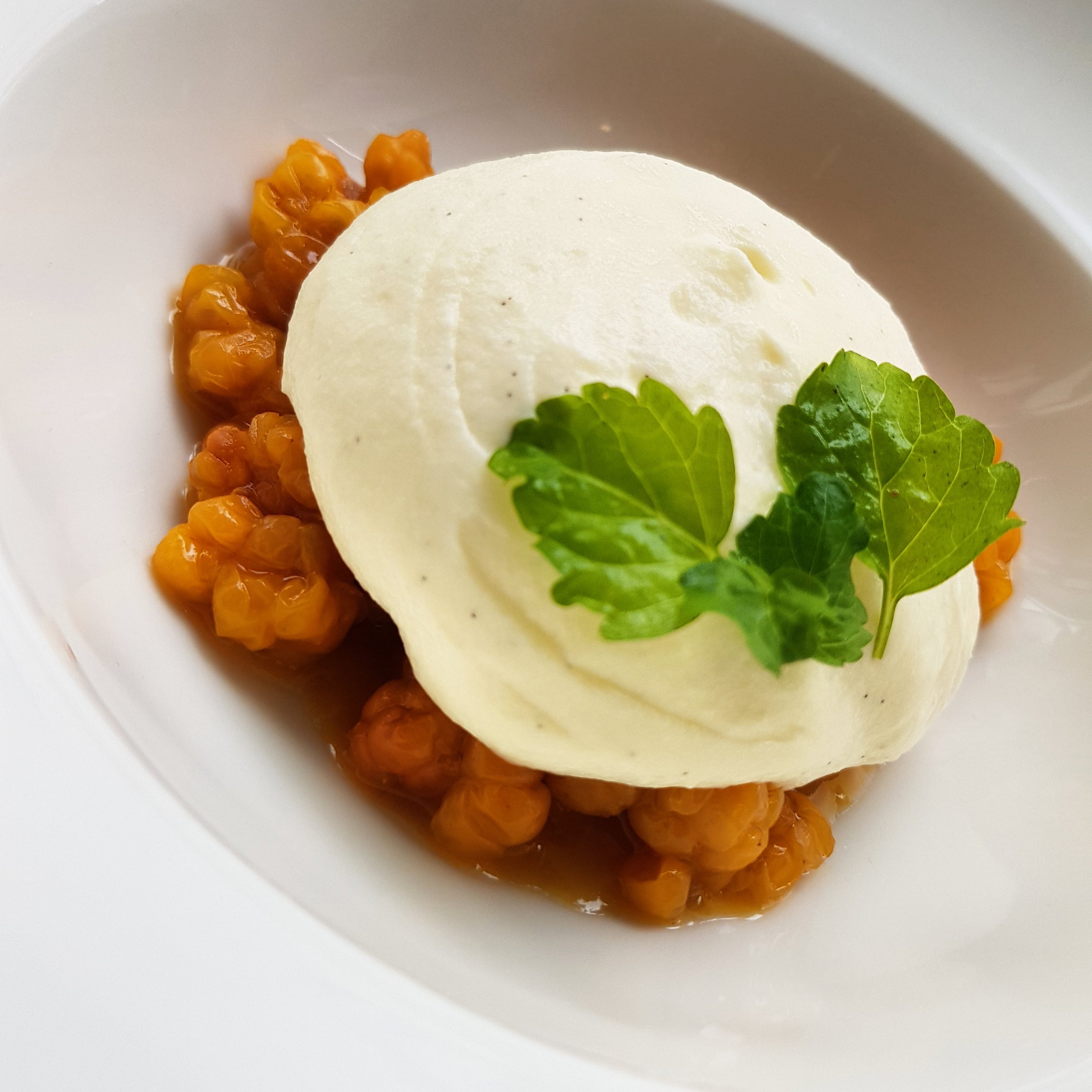 Vi myltar hjortron från Söderhamn och serverar dessa med cremé patisierre och mandelkaka.