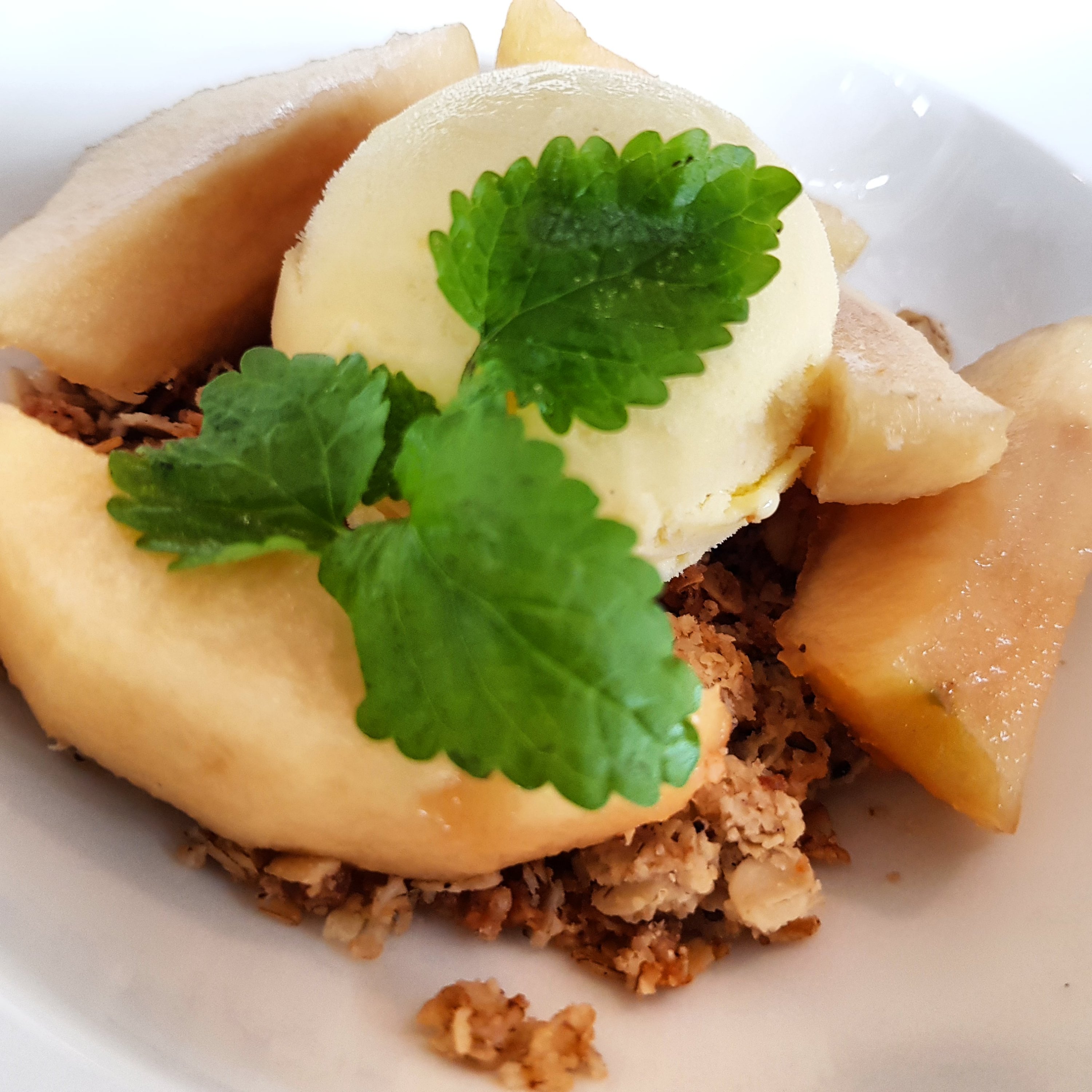 Vi karamelliserar lokala äpplen och serverar dessa med smörstekt havre samt vår egen vaniljglass.