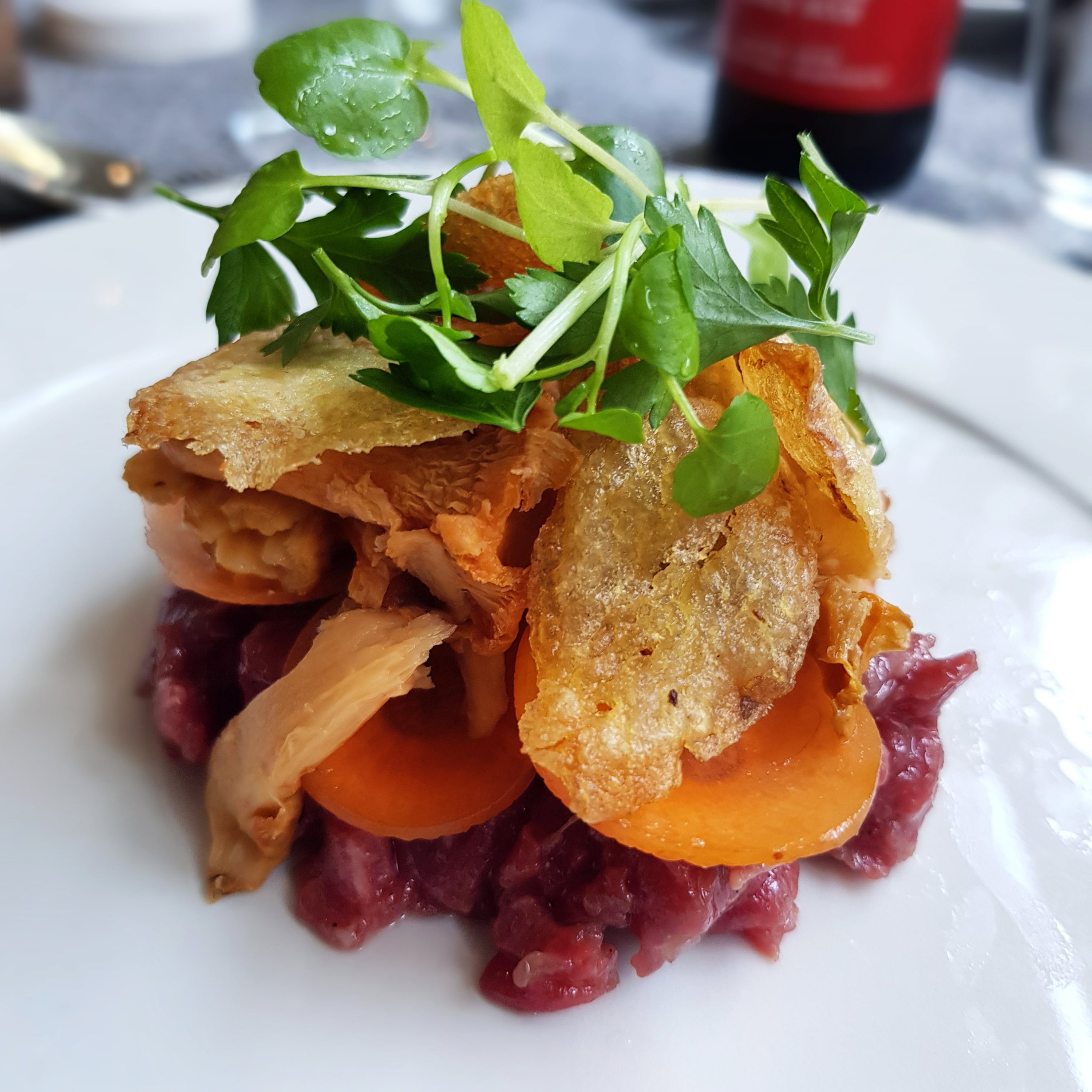 Biff från svenska gårdar serveras med lokala kantareller, morot, lökvinägrett och krispig potatis.