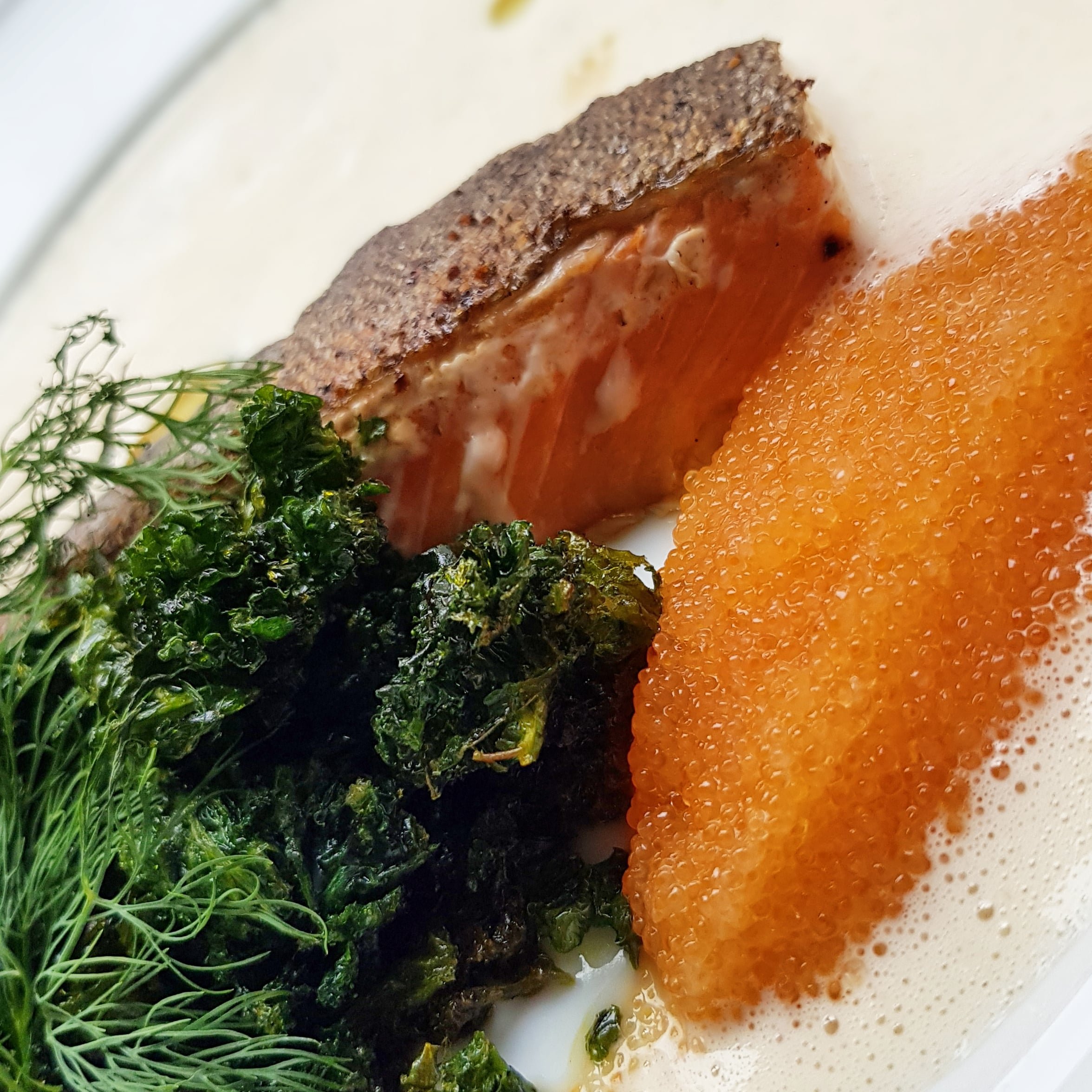 Regnbåge från Ljusnan och bröderna Olsson serveras med grönkål, löjrom, rotsellerisås och småpotatis med lokala kantareller.