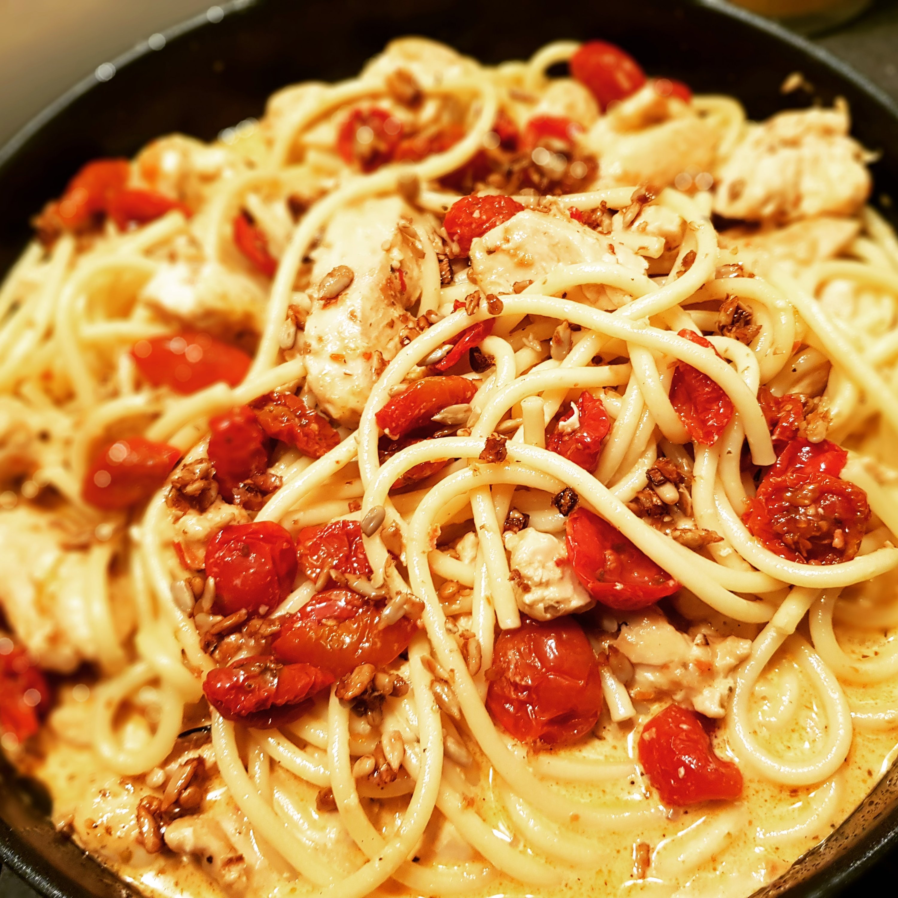 Jag blir oftast väldigt glad över att få bli bjuden på hemlagat. Vem blir inte? I helgen fick jag avnjuta en god krämig kycklingpasta med soltorkade tomater och med ett härligt fras på rostade pinjenötter, vitlök och honung som fick glänsa på toppen. Mycket gott tillsammans med ett glas rött.
