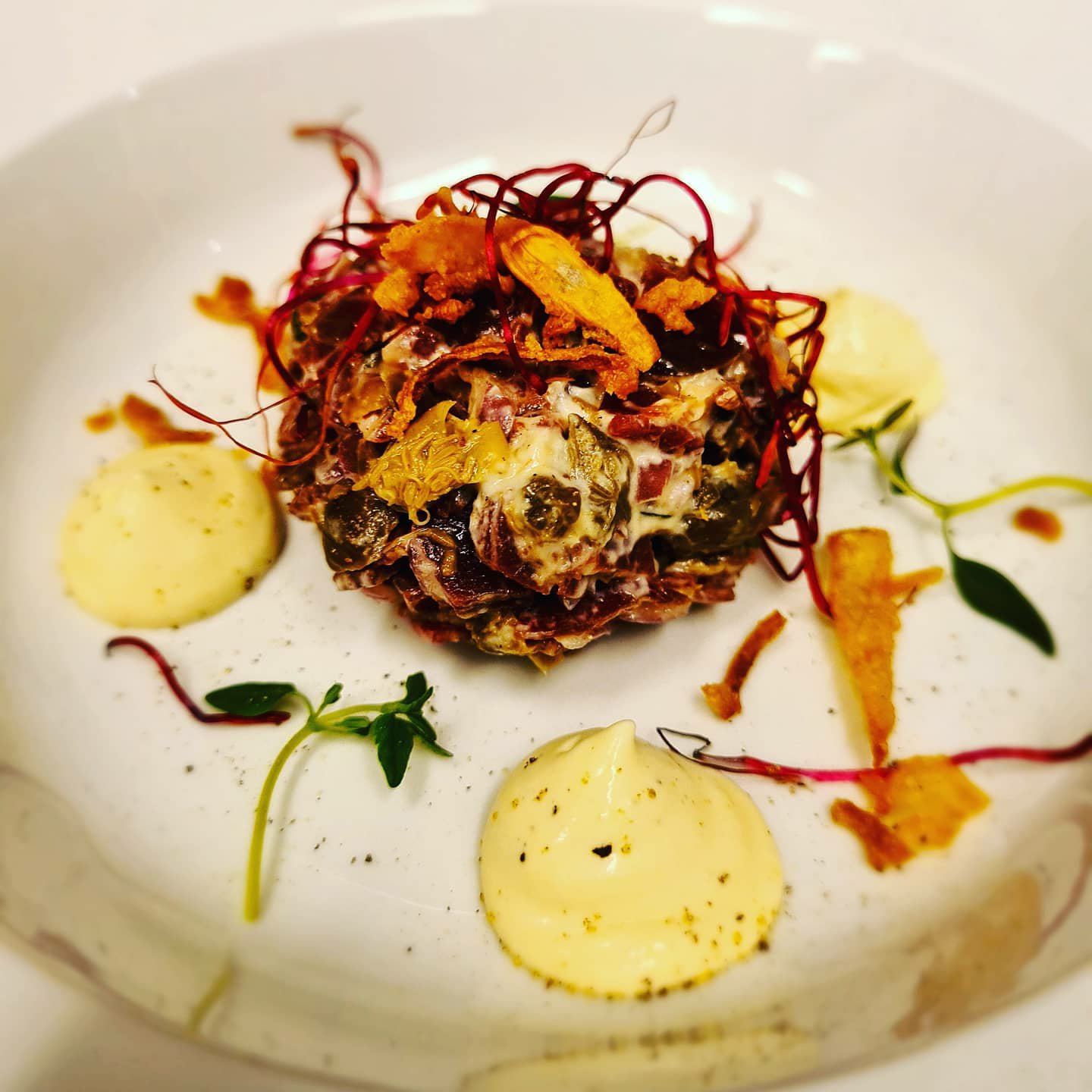 Här ser ni en lyxig tärnad tartar gjord på Bresola, saltkapris, lök, timjan, salt och peppar som har fått gotta runt i ekologisk olivolja och vitvinsvinäger tillsammans med honung, dijoncremé och vispad smetana.