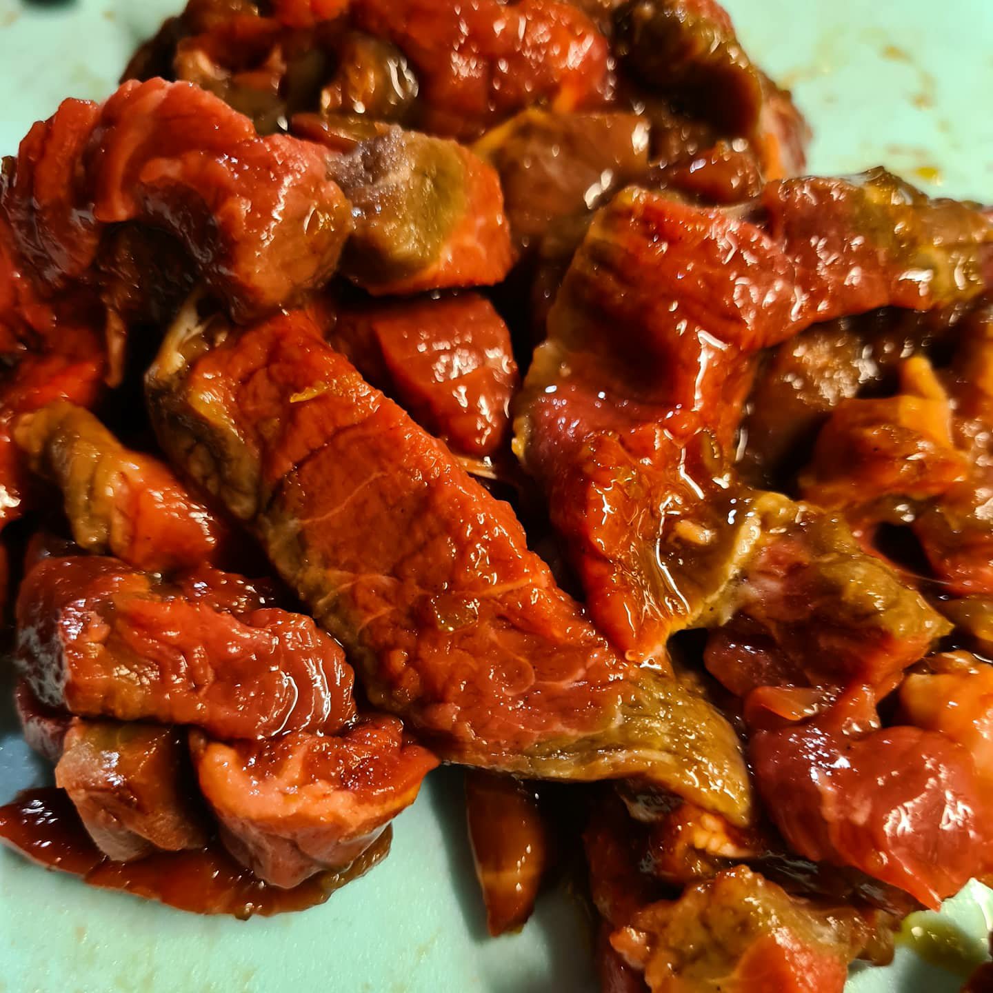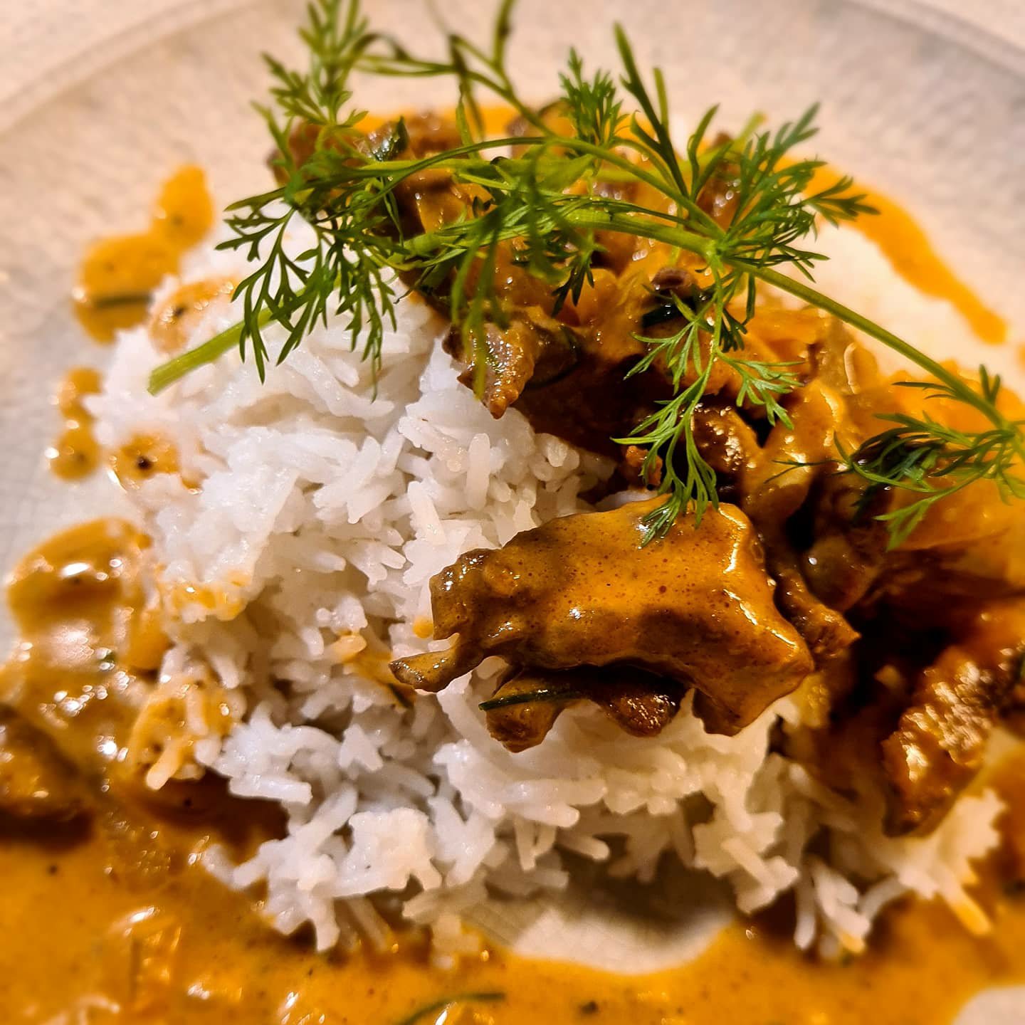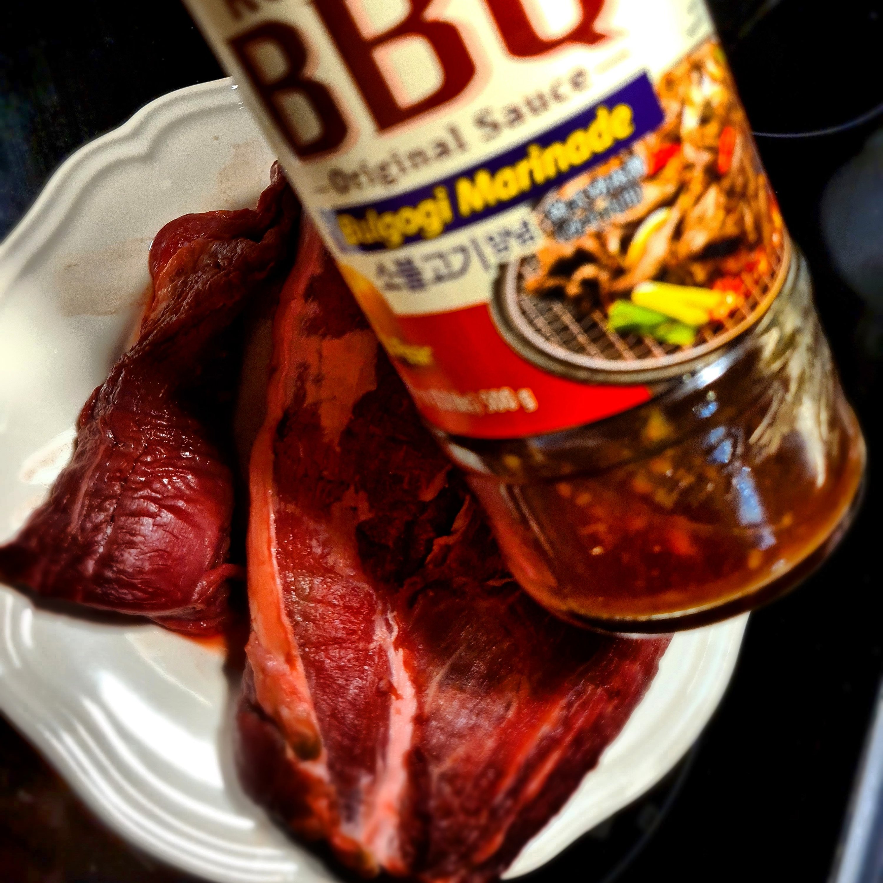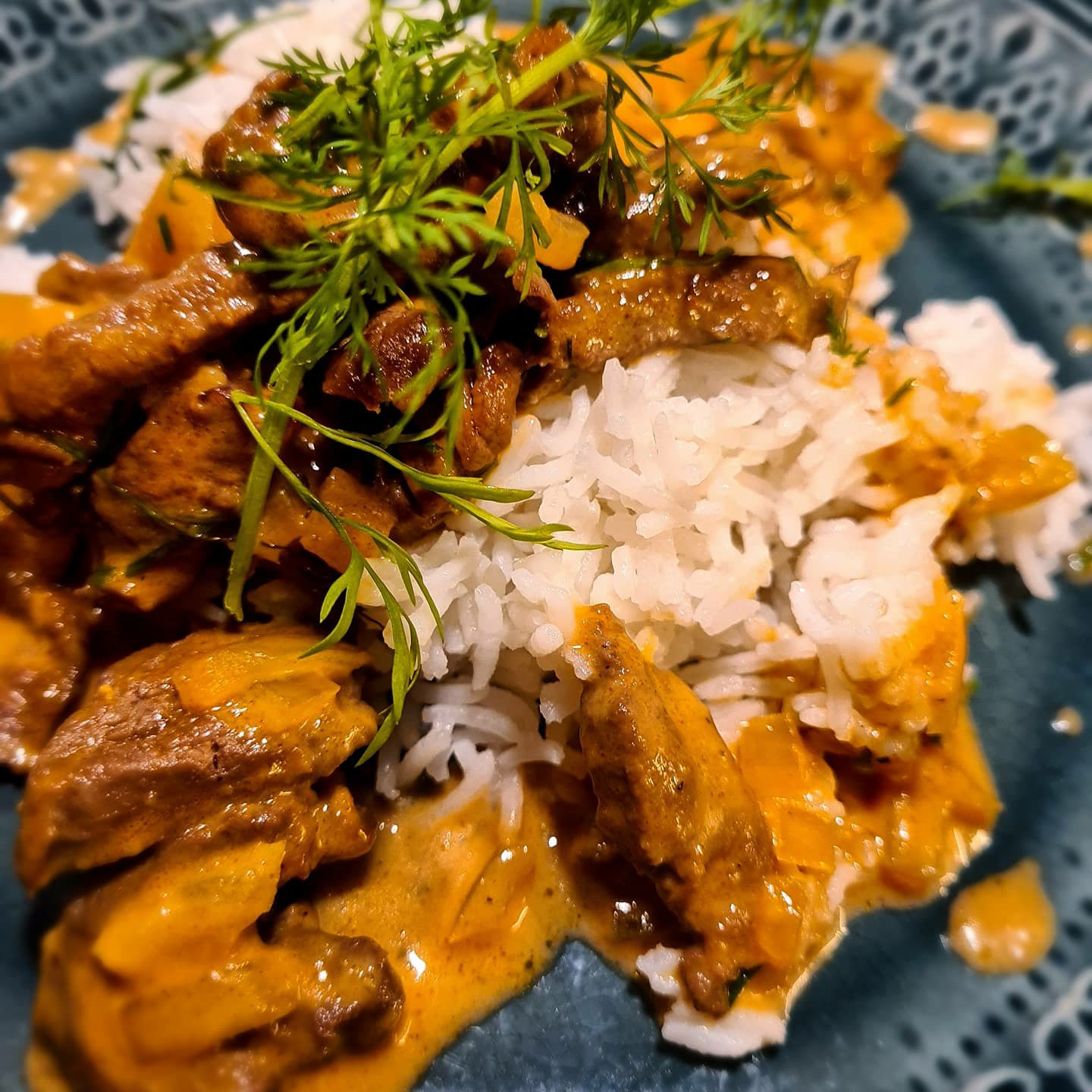 Jag marinerar oxfilé i koreansk bbqsås och låter det ligga och dra. Finhacka lök, vitlök och stek med smör/olja, tomatpuré och dijonsenap. Fräs ner köttet och rör om och häll sedan i en skvätt grädde, salta och peppra.