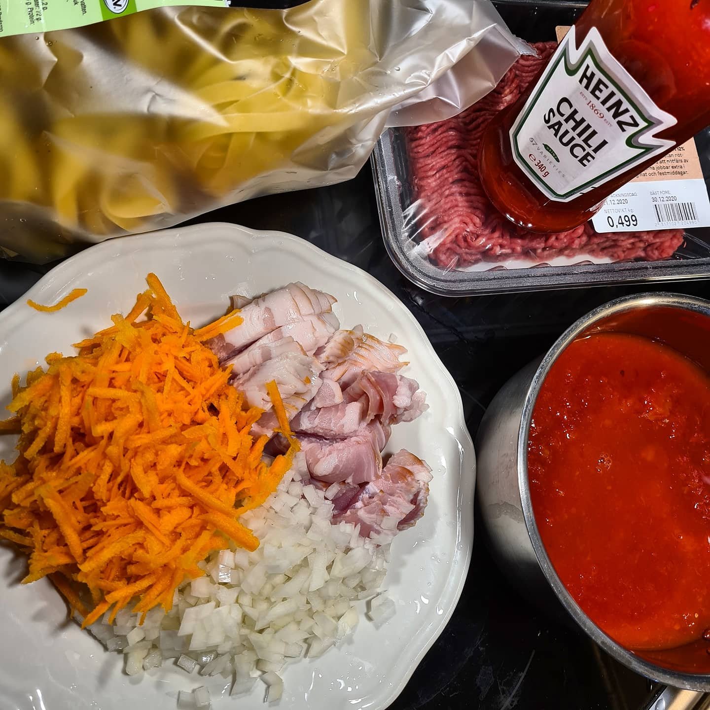 Stek lök och vitlök i smör, hacka ner rökt bacon och låt det stekas ihop innan färsen åker ner. Salta och peppra. Färsen suger sig åt salt men var ändå försiktig. Koka ihop en tomatsås och häll ner i färsen och rör om. Låt det sjuda helst ett par timmar.