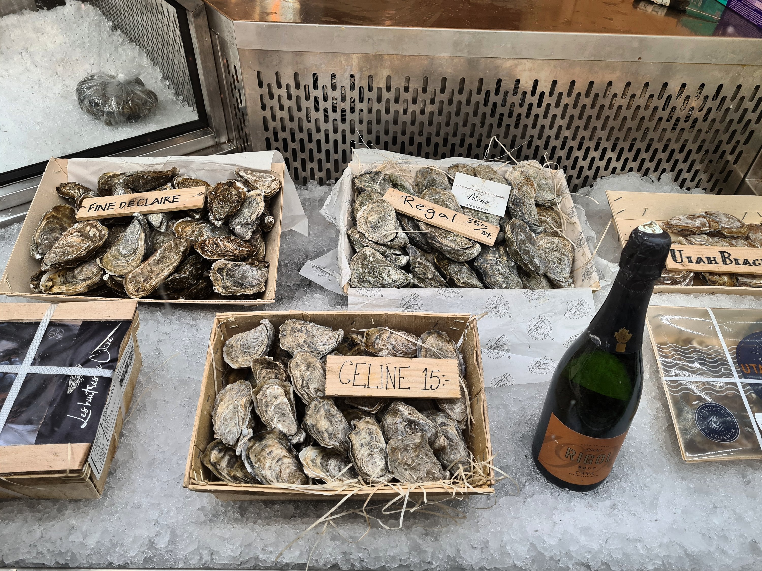 En bricka Celine till exempel kan ni äta på plats för 150 kronor. Då ingår det 6 ostron och ett glas bubbel.