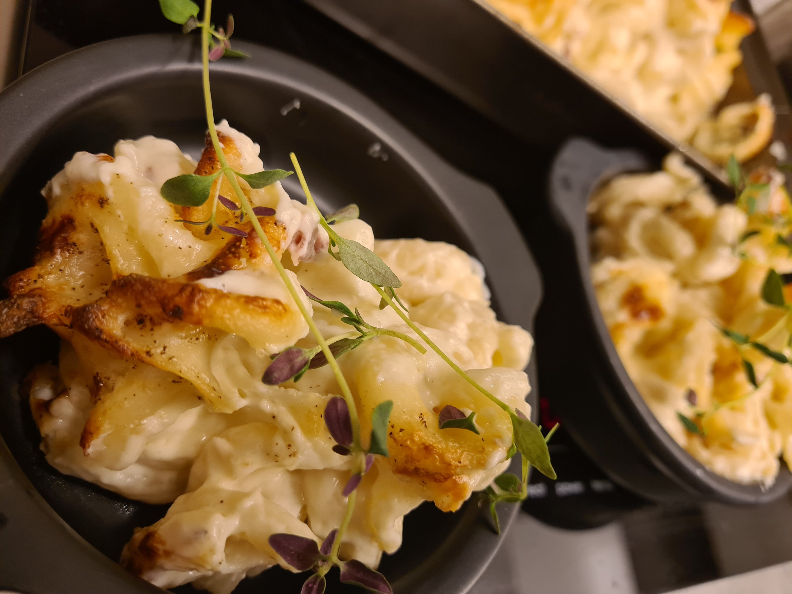 Koka lite roliga pastaskruvar, smält mer smör i stor kastrull och vänd ner lite mjöl. I med laktosfri grädde lite i taget och rör om med vinäger, all ost, salt och cayennepeppar. I med allt på en plåt, in i ugn.