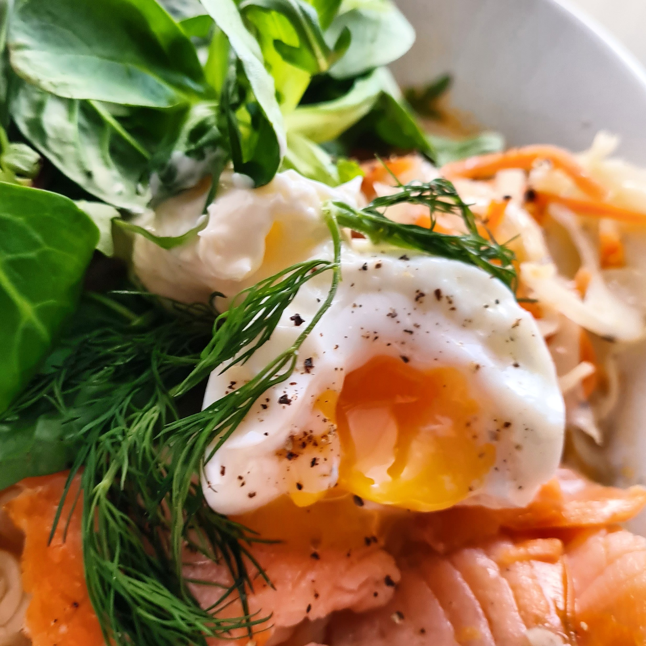 Häll fonden i en skål, ner med grönsaker och nudlarna, på med valfria proteiner (jag tog gravad lax) och ett 4 minuters kokt ägg samt en vispad kryddmajonnäs med dill.