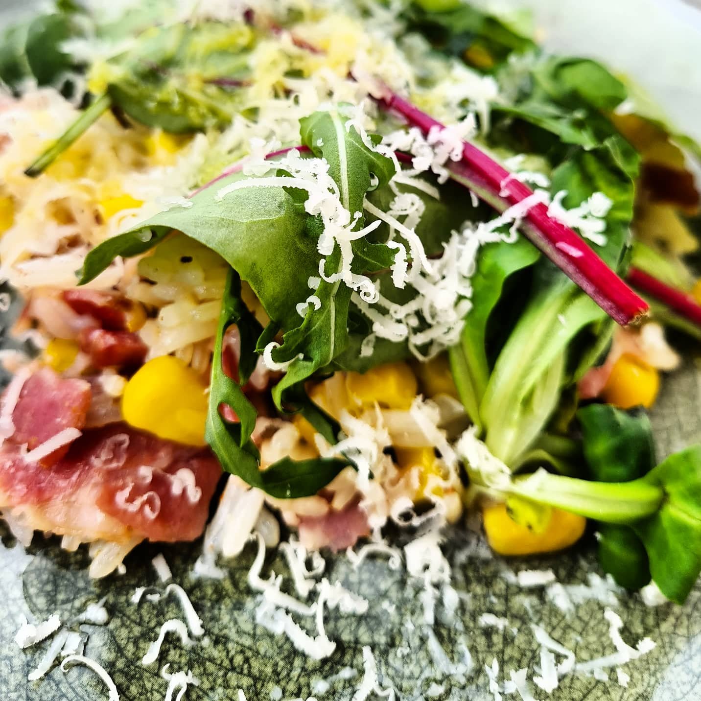 Kastrullen åker på, koka ris, steker, majs, pancetta och riset med chili, cayennepeppar, salt, vitlök och peppar.