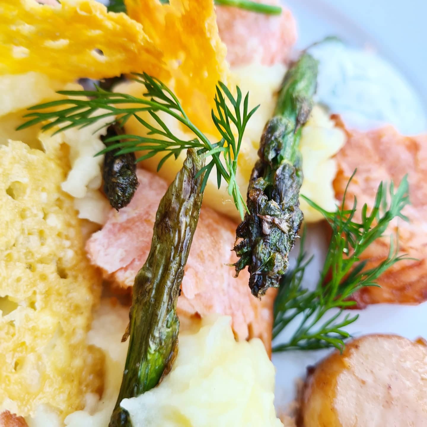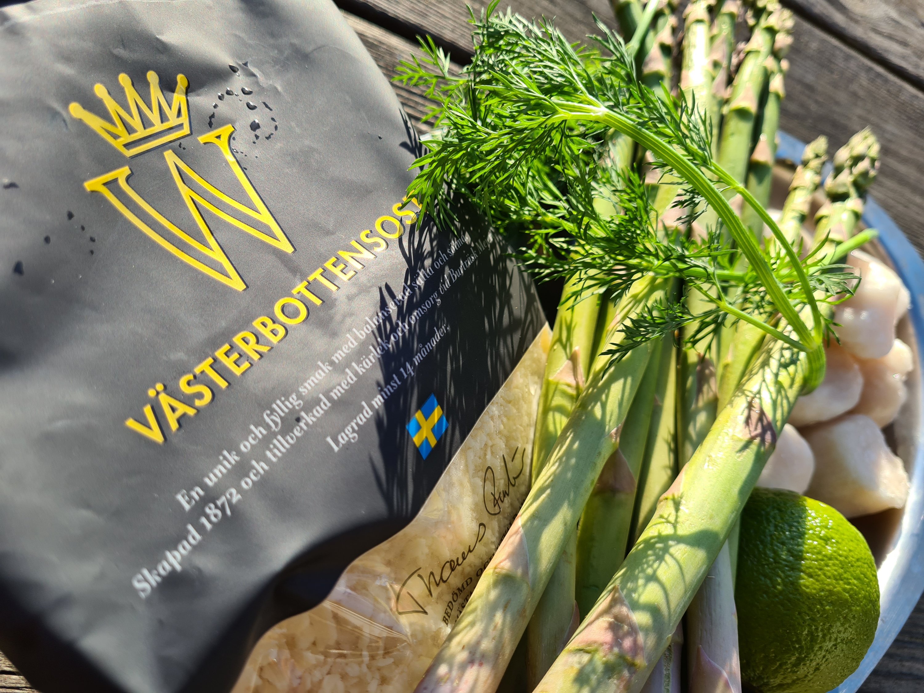 Mera än så behövs inte. Bryner på smör och ner med förkokt sparris, salta. Pressa ner lime, vitvinsvinäger, salt och dill som du rör ner i ej laktosfri ceme fraiche. Smaka av och tillsätt det som du tycker saknas. Innan servering öser du på med västerbottensost på ett smörpapper och kör in i ugnen tills du ser en brungyllene färg.
