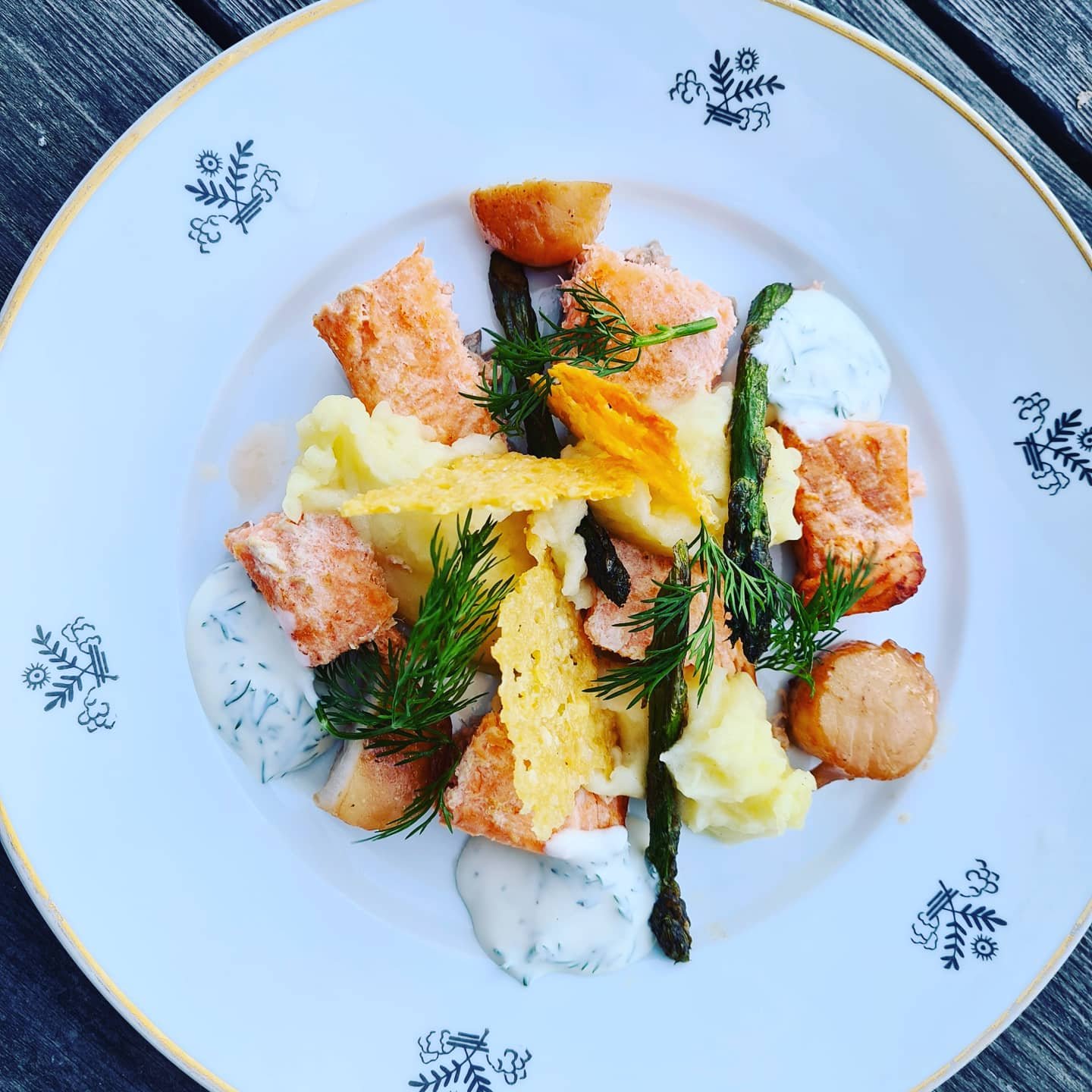 Smörstekta lax på båda sidorna innan den åker in i ugnen med en storklick smör och olivolja. Under tiden drar du på en potatismos med grädde, vitpeppar, salt, laktosfri grädde och smör. Rör om.