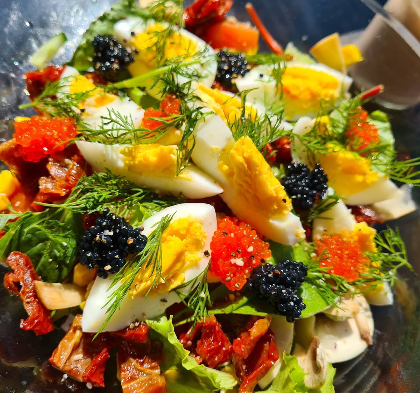 Jag fick en längtan efter smörgåstårta då jag toppade med tångcaviar, ägg och dill samt en egenslagen laktosfri sås på crème fraîche, gräddfil, citronsaft, sambalolek, salt, peppar och lite honung.