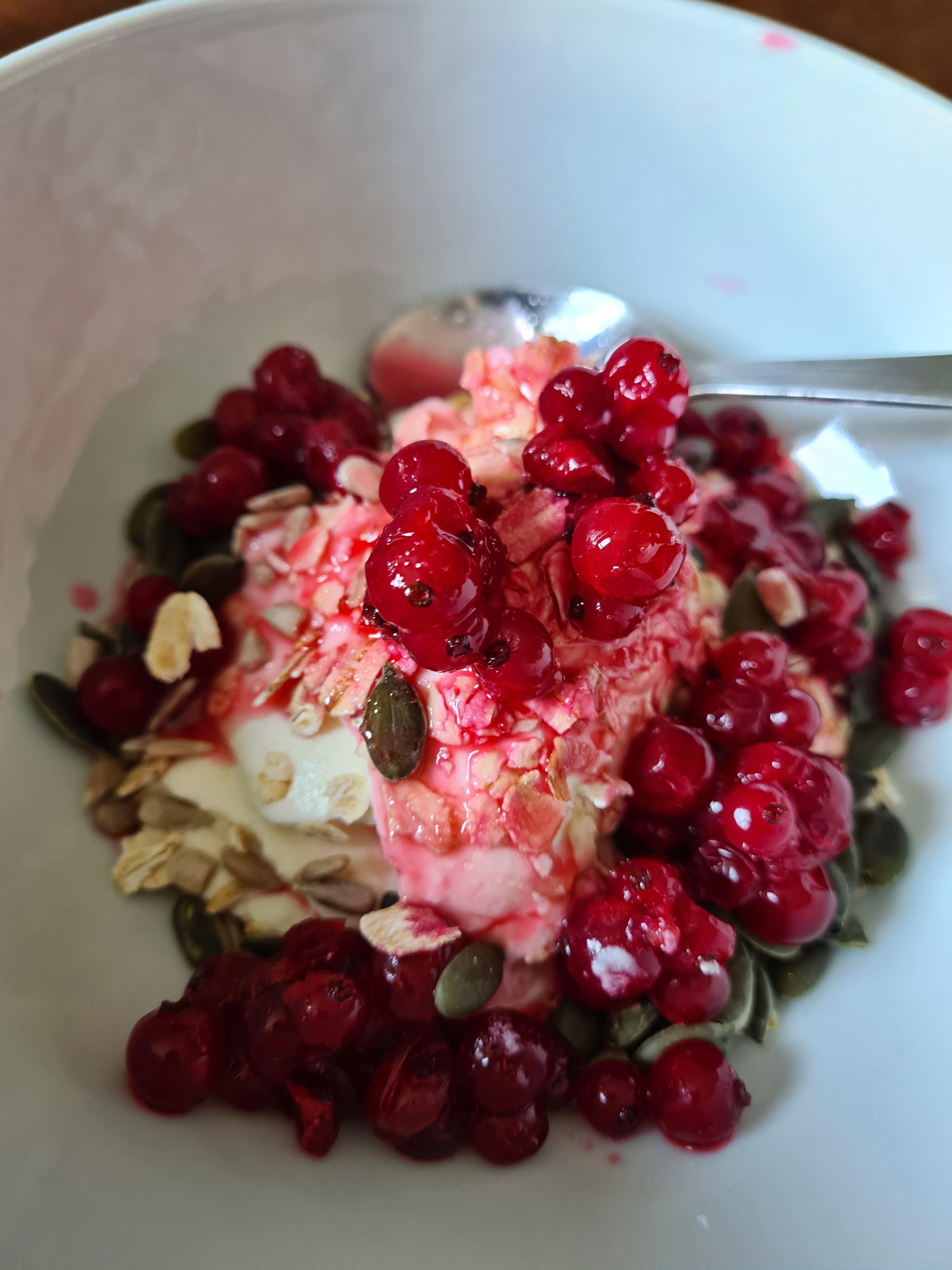 En skål med laktosfri yoghurt, färska bär och rostade pumpa och solrosfrön ger en bra start på dagen tillsammans med ett snabblagat bröd på mjölk, havregryn, pumpafrön, solrosfrön, chiafrön, salt, smör och lite honung du rör ihop till en halvkletig konsistens, klicka ut på bakplåtspapper och in i ugnen ca 25 min på 225 grader. Allt är en smaksak hur mycket fras du önskar samt färg.