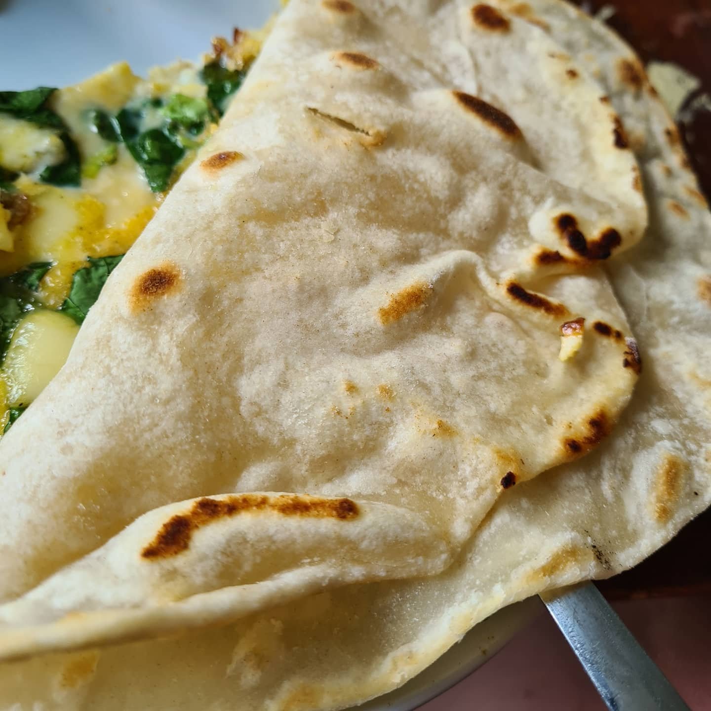 Här ser ni perfekt stekt bröd på endast mjöl, salt och lite vatten som är utkavlad till det tunnaste av det tunna. Det serveras med omelett på ägg, grädde, spenat, ost, chili, salt och peppar. Det är inte alla dagar en får så fin frukost.
