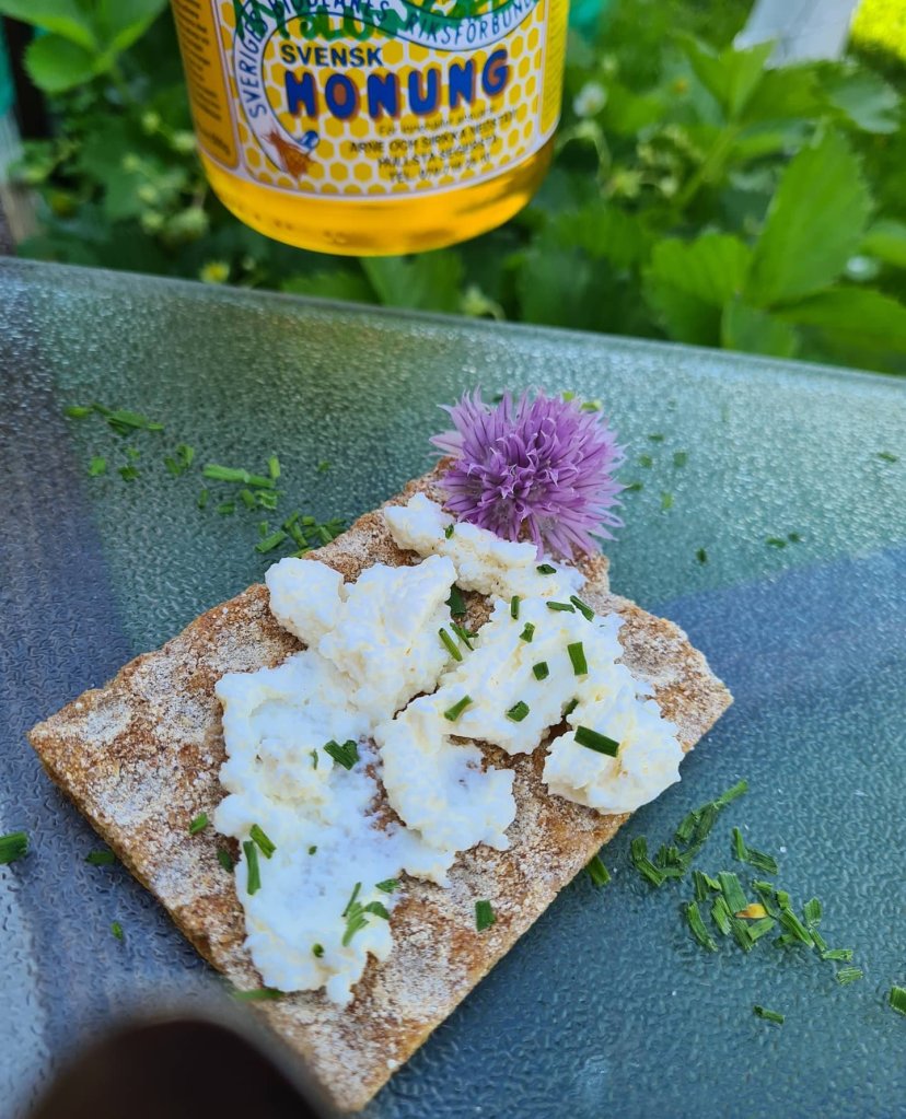 Den här äggosten har inte alls lika mycket socker som ett ordinarie recept så det känns inte så sött vilket gör att jag klickar på en bit äggost och strör över lite sallad, salt och gräslök på en knäckebröd skiva. Det är himmelskt. Jag testade även lite nyslungad honung från Hullsta men det passar bättre till nyrostat.