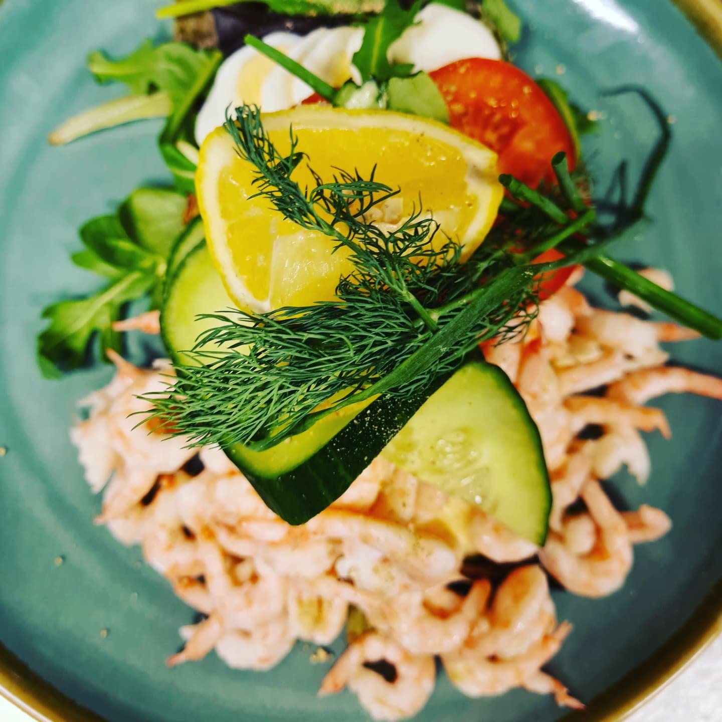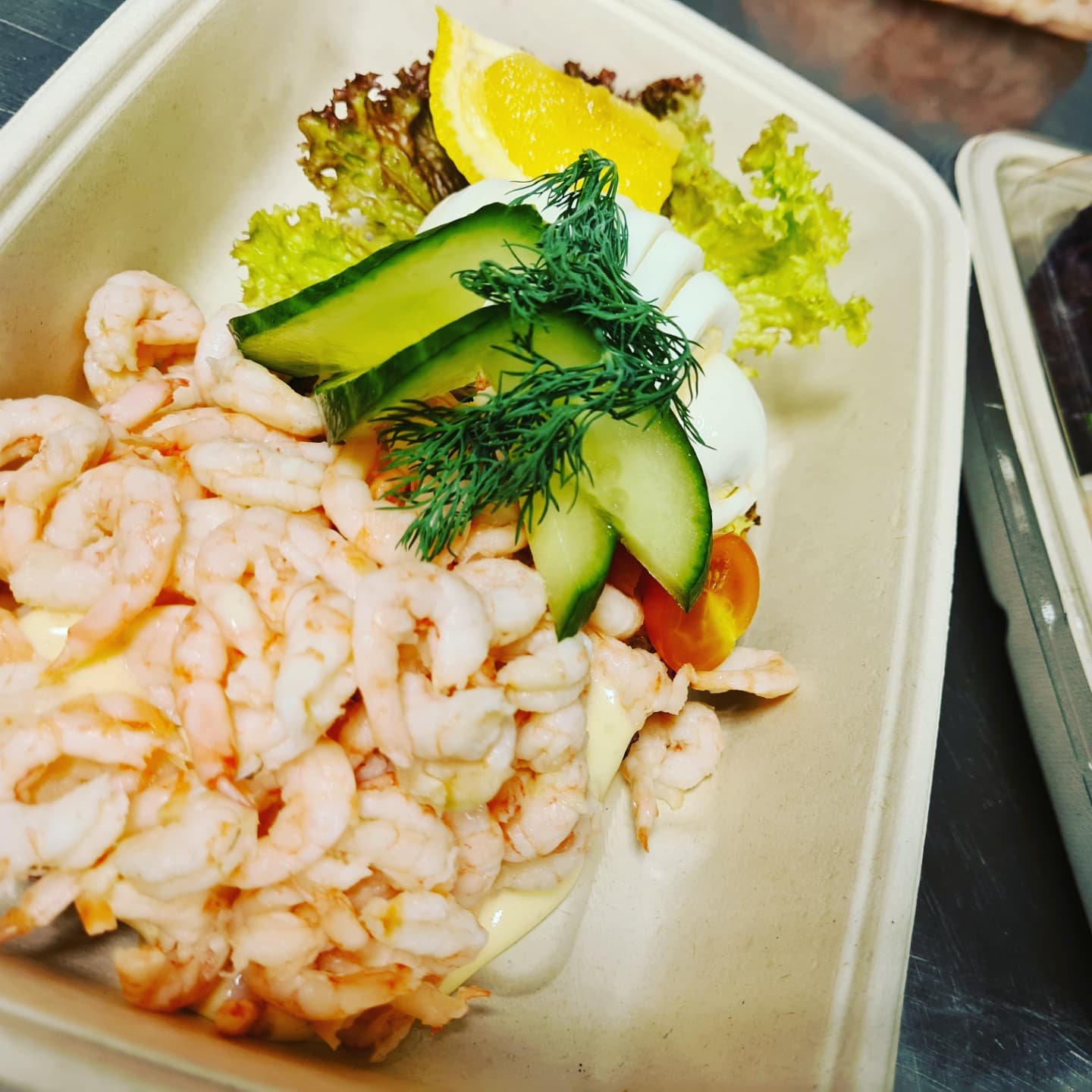 Tänk er en god räksmörgås med egenslagen majonnäs, handskalade räkor, gurka, tomat, citron och dill.
