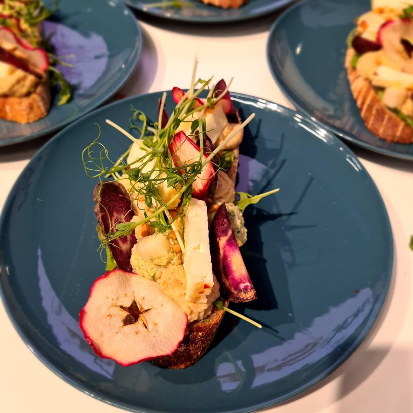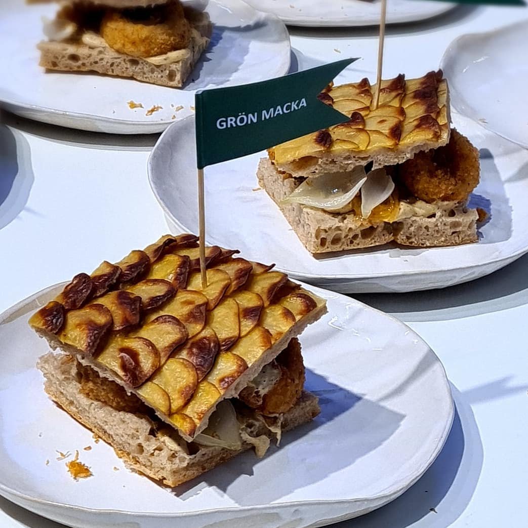 Grunden är ett surdegsbröd av kulturspannmålen algovete och Ölandsvete från Råberga kvarn, täckt med tunnskivad potatis. Rostad lökmajonnäs, gul lök, mjölksyrad potatischutney, syrad lök, friterade lökringar panerade i ströbröd från brödkanterna, toppad med potatiscrisp.