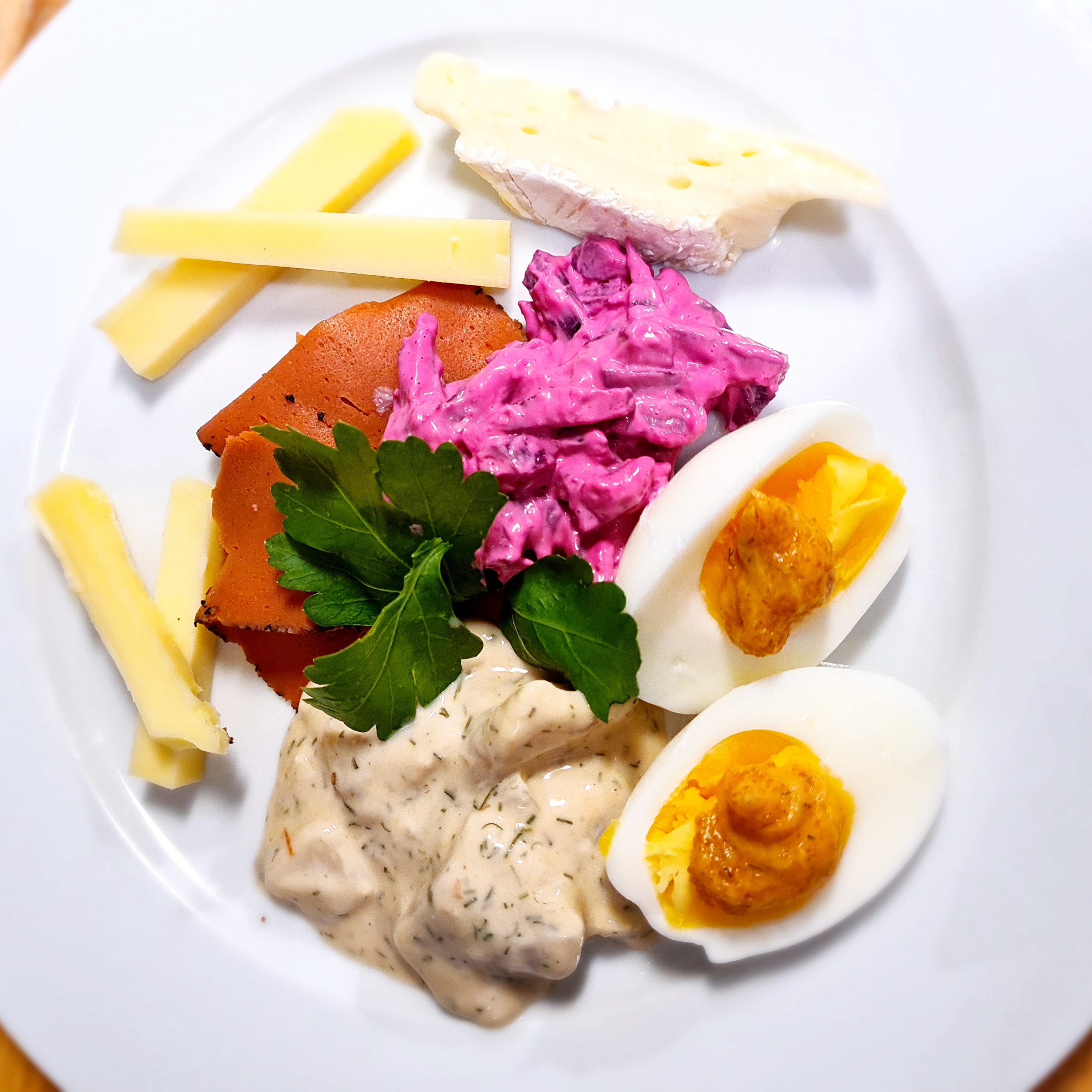 Här ser ni en vegansk och vegetarisk jultallrik med kokt ägg som toppas med vegiar eller tångcaviar ”Rostbiff” med smak på peppar och persilja som avnjöts med rödbetssallad. Kräftmarinerad sill med kokt potatis. Avluta med lite goda ostar som grottlagrad gruyère, kaltbach och Brie de Meaux med en bit saffransskorpa.