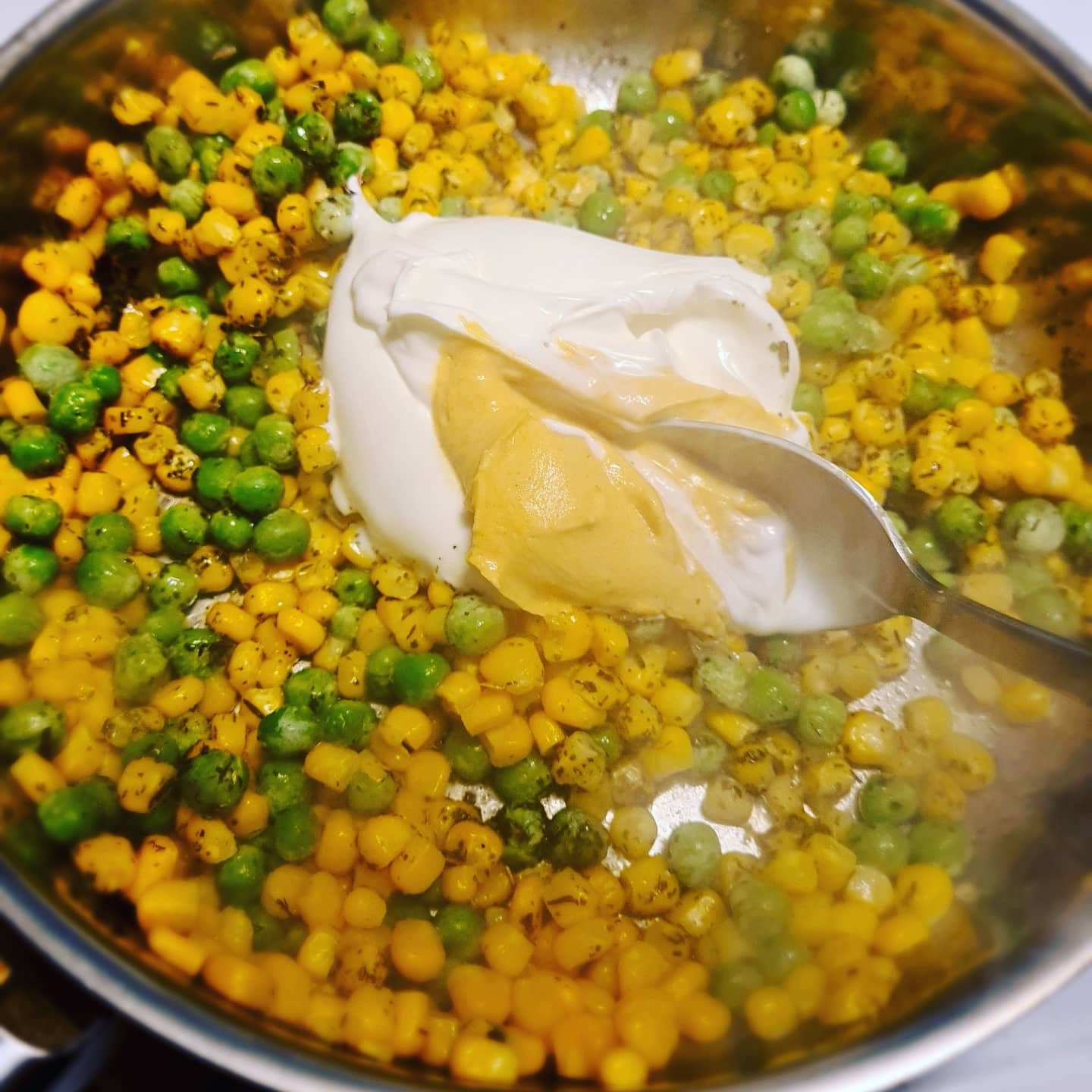 Vi blancherade lite lätt schalottenlök, vitlök i smör och ekologisk novello olivolja från Ricci_import med majs, ärtor, dijonsenap, ramslök och hetta upp det i pannan.