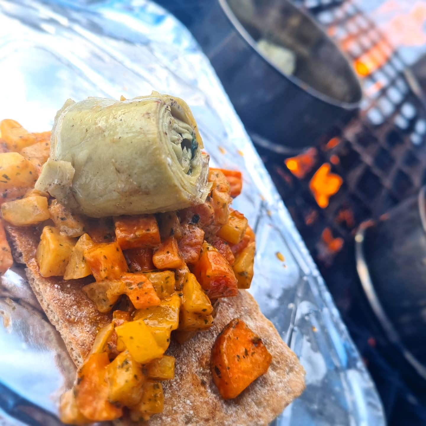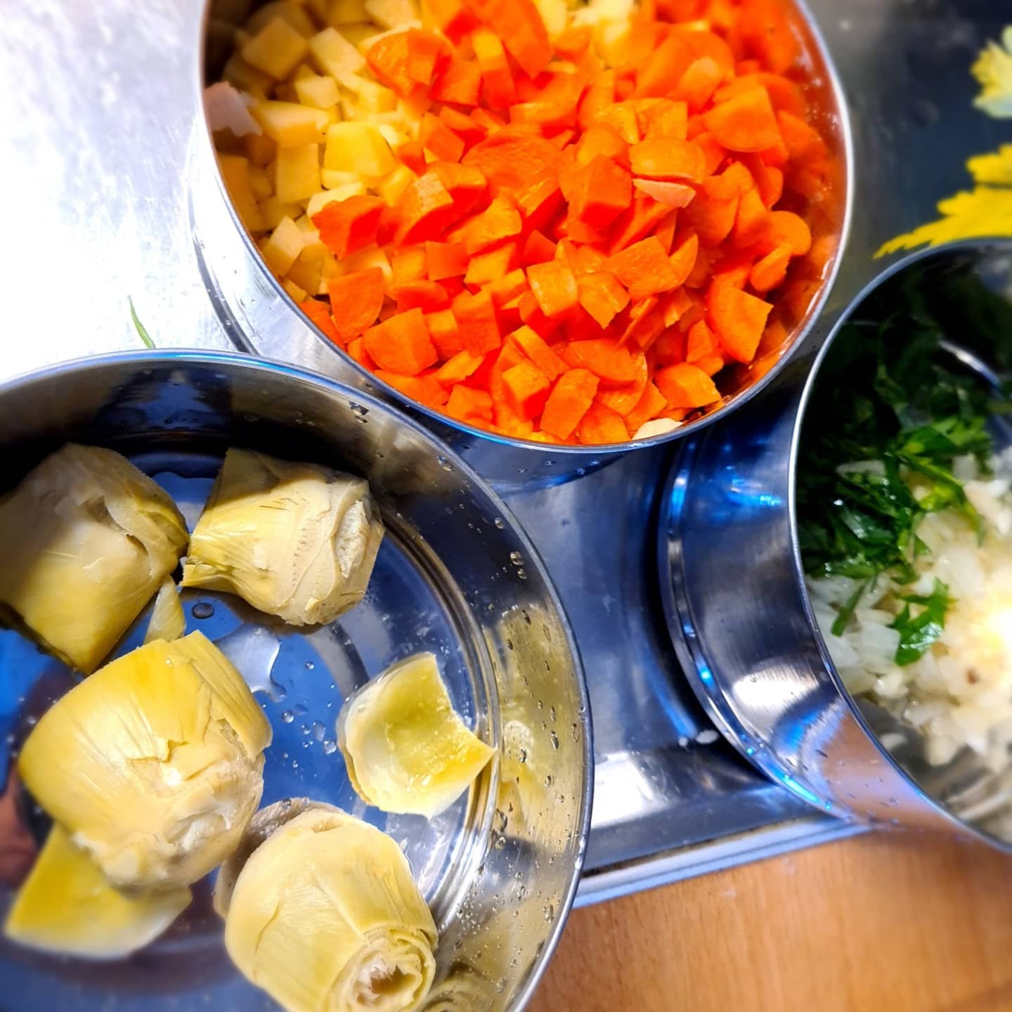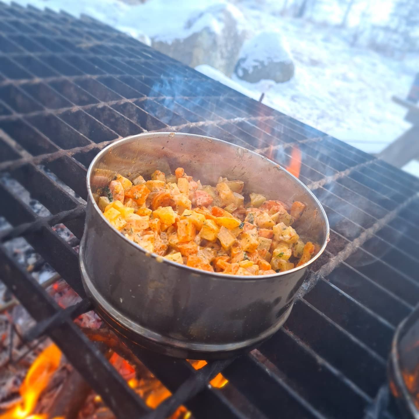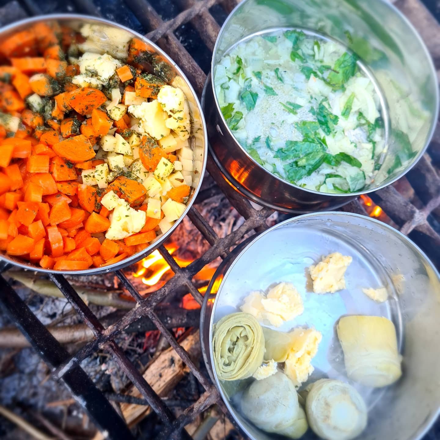Idag var det ett perfekt väder för matlagning över öppen eld utomhus. Vi hackade ihop morötter, schalottenlök, potatis, ramslök, chili, persilja, salt, vitpeppar, vitlök, novello olivolja från ricci_import och hembygdssmör från Löts Gårdsmejeri. Till detta serveras kronärtskocka i brynt smör.