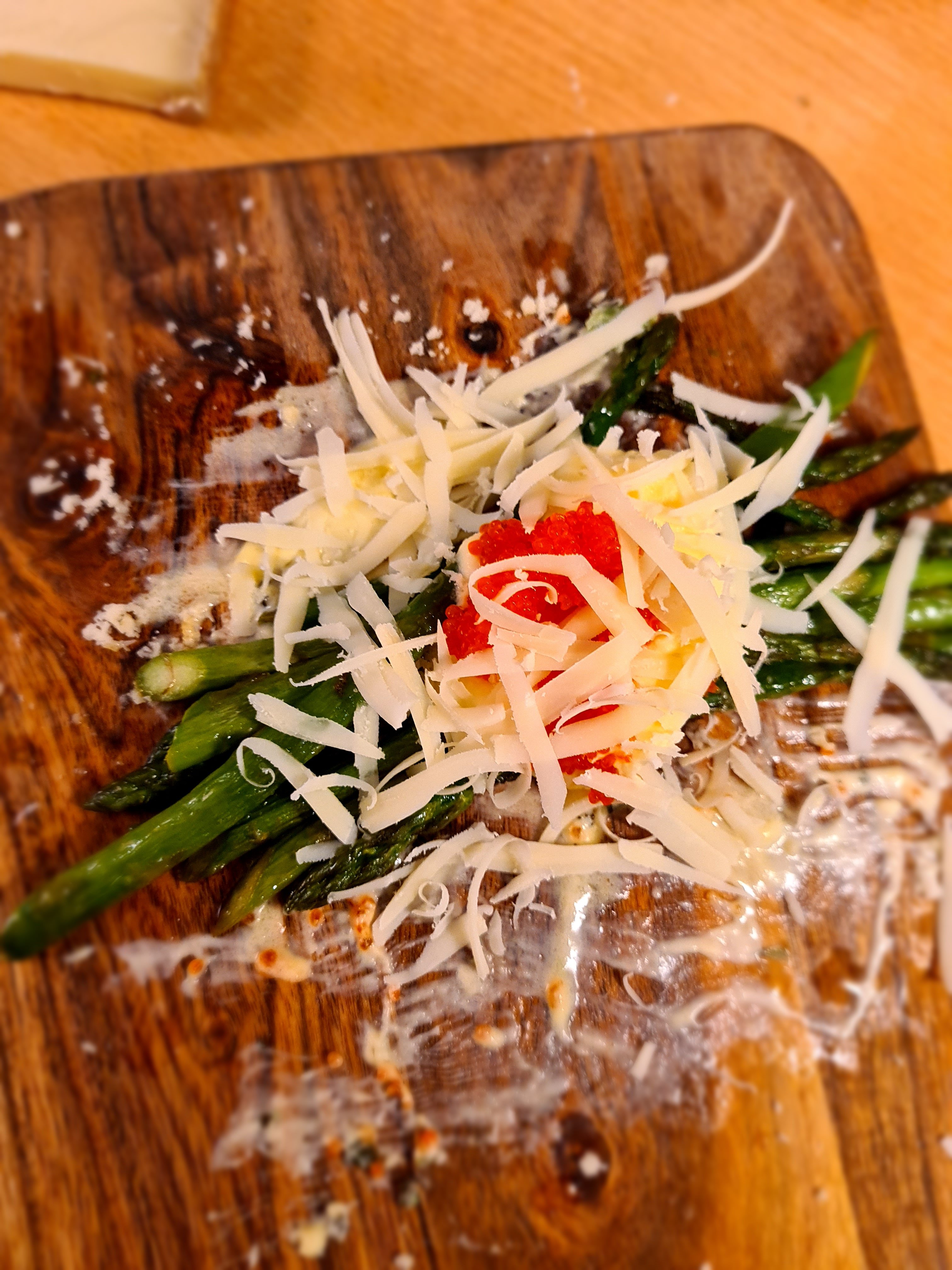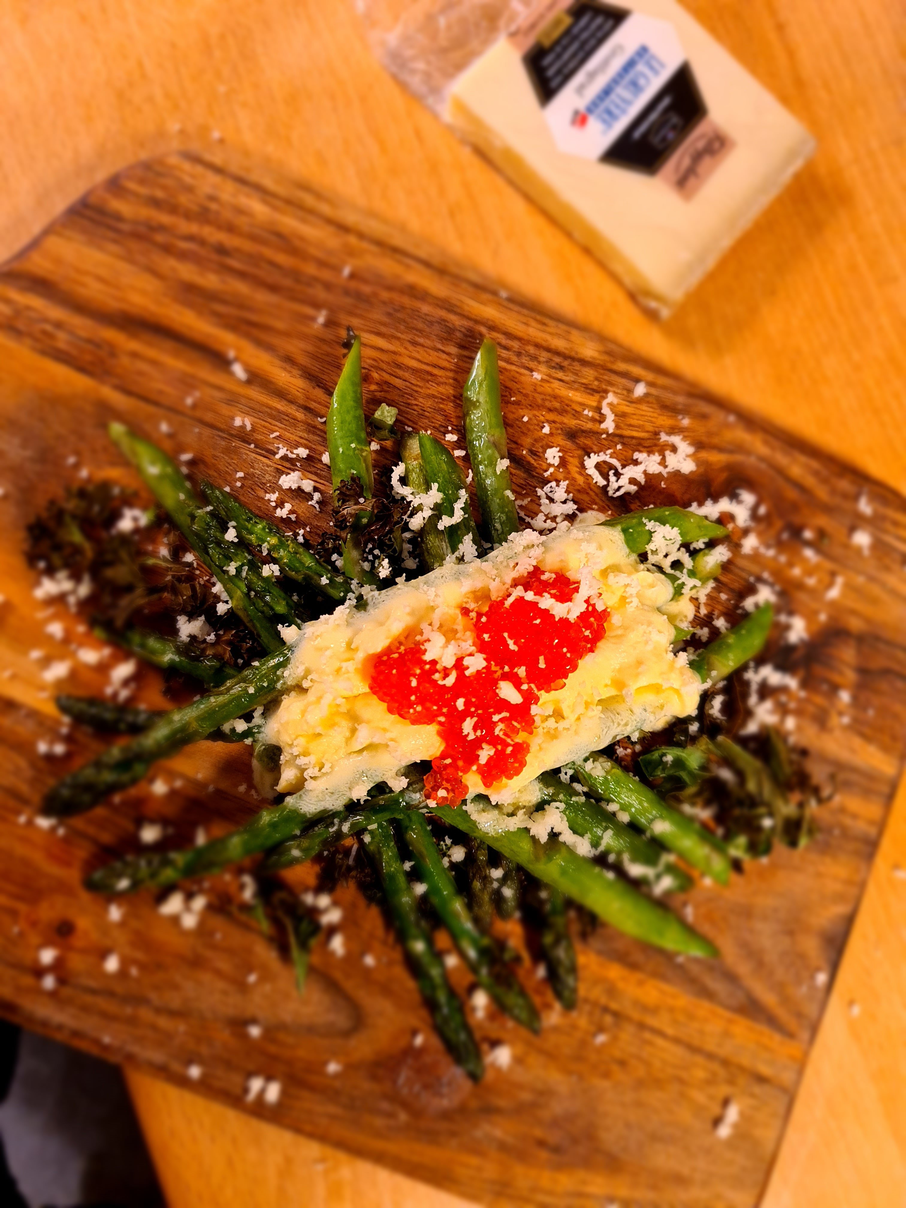 Det blev smörstekt sparris med hollandaisefraiche och grottlagrad gruyère som toppas med tångcaviar på en bädd av friterad grönkål. För att inte prata om akaciabrädan jag fick i en julkalender som kanske gör maträtten komplett?