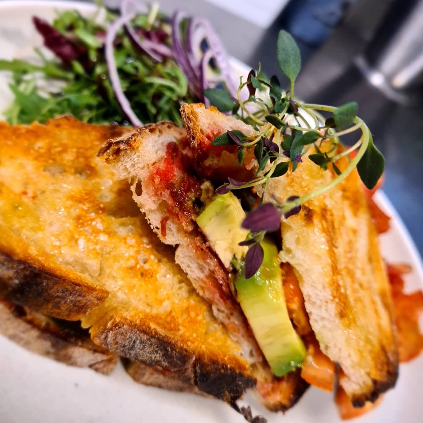 En härligt grillad vegansmörgås med veganpesto, rödbetsröra och avokado. Veganpeston fylls med kapris, basilika, ruccola, salt och olivolja som får mixas ihop med en skvätt vatten om det behövs.