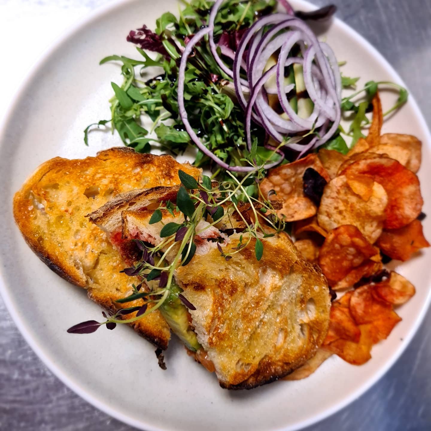 Till detta skivar jag en avokado, slantar tomater och serverar med sallad och rotfruktschips.