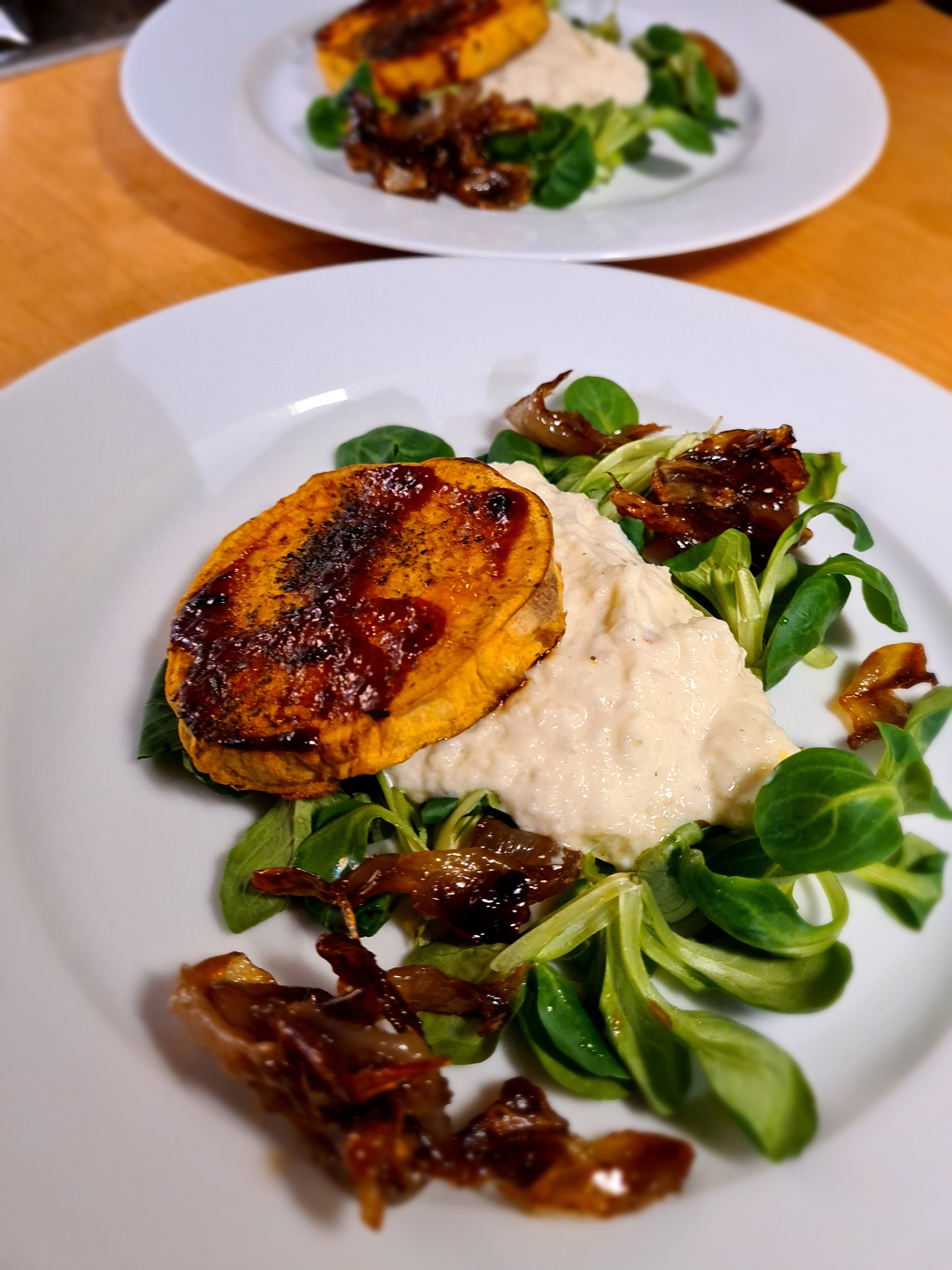Då var där dags för en liten bbq- sötpotatisburgare med blomkålsmos, karamelliserad schalottenlök på manchesallad som jag hade kvar från helgen. Jag hinner inte skriva ner något recept men det är enklare sagt än gjort. Sötpotatis-slantar som du marinerar i en vegansk marinad. Socker, rökt paprika eller chili, apelsinjuice eller ananasjucie, salt och peppar.