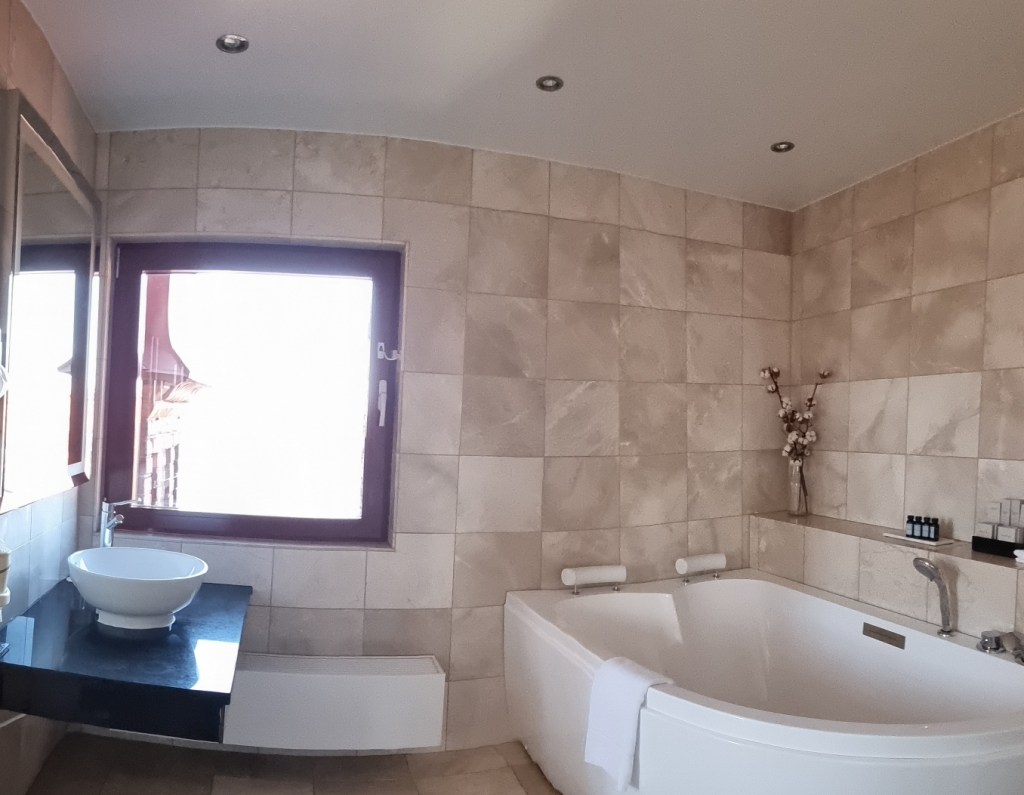 Vilken oas med havsutsikt från alla håll och kanter. Inredningen är smakfullt elegant med badkar och dusch med utsikt över böljan blå.