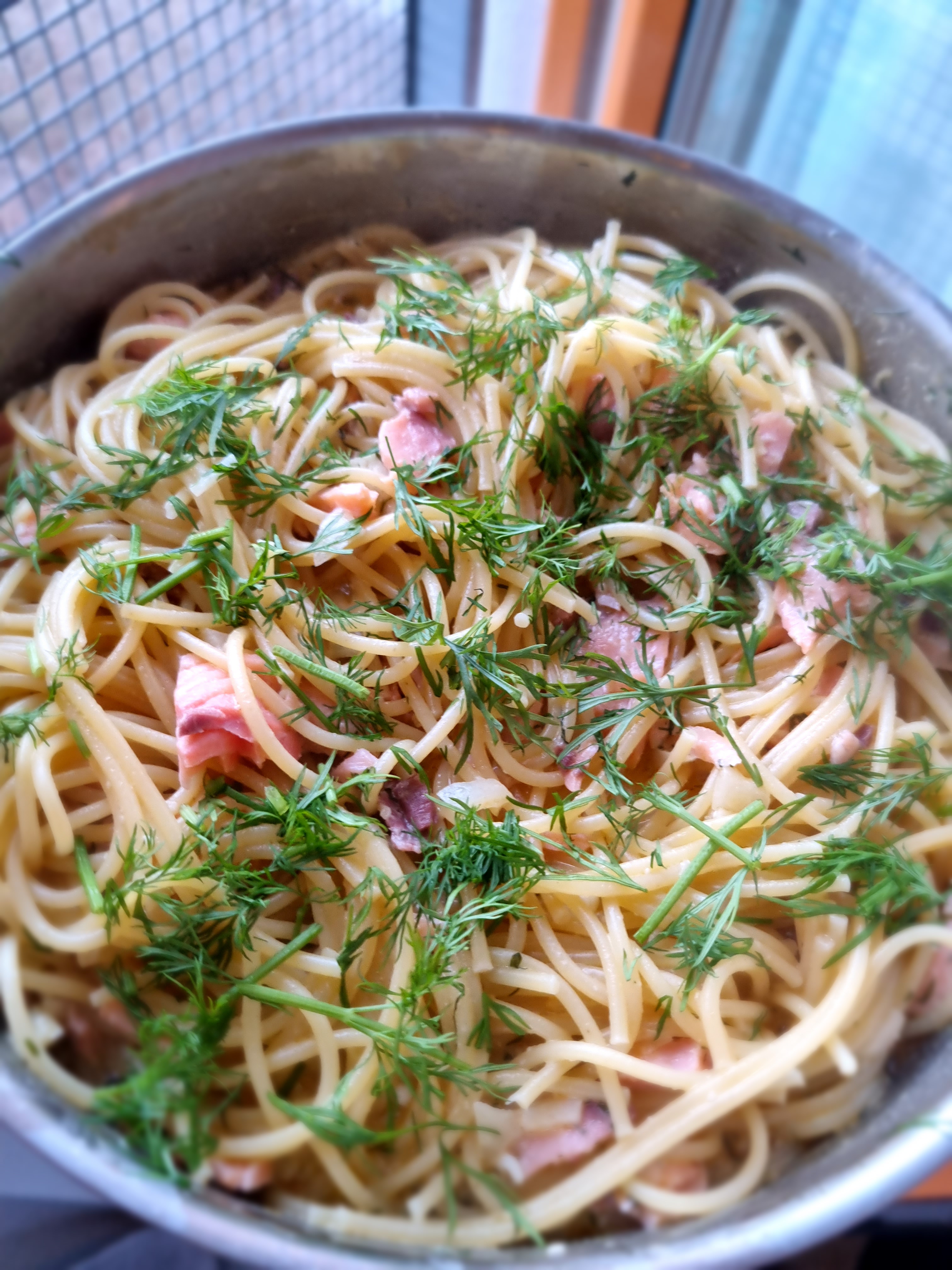 En krämig laxpasta med gullök, finhackad vitlök, chèvresmul, ädelost, tomatpuré, hummerfond, vitvinsvinäger, dill och laktosfri grädde är det enda du behöver för att få ihop en god lunch. Jag brukar köpa ett litet paket kallrökt lax eller röra ner varmrökt när spaghettin är klar. Då blandas sältan ut perfekt tillsammans med alla goda smaker.
