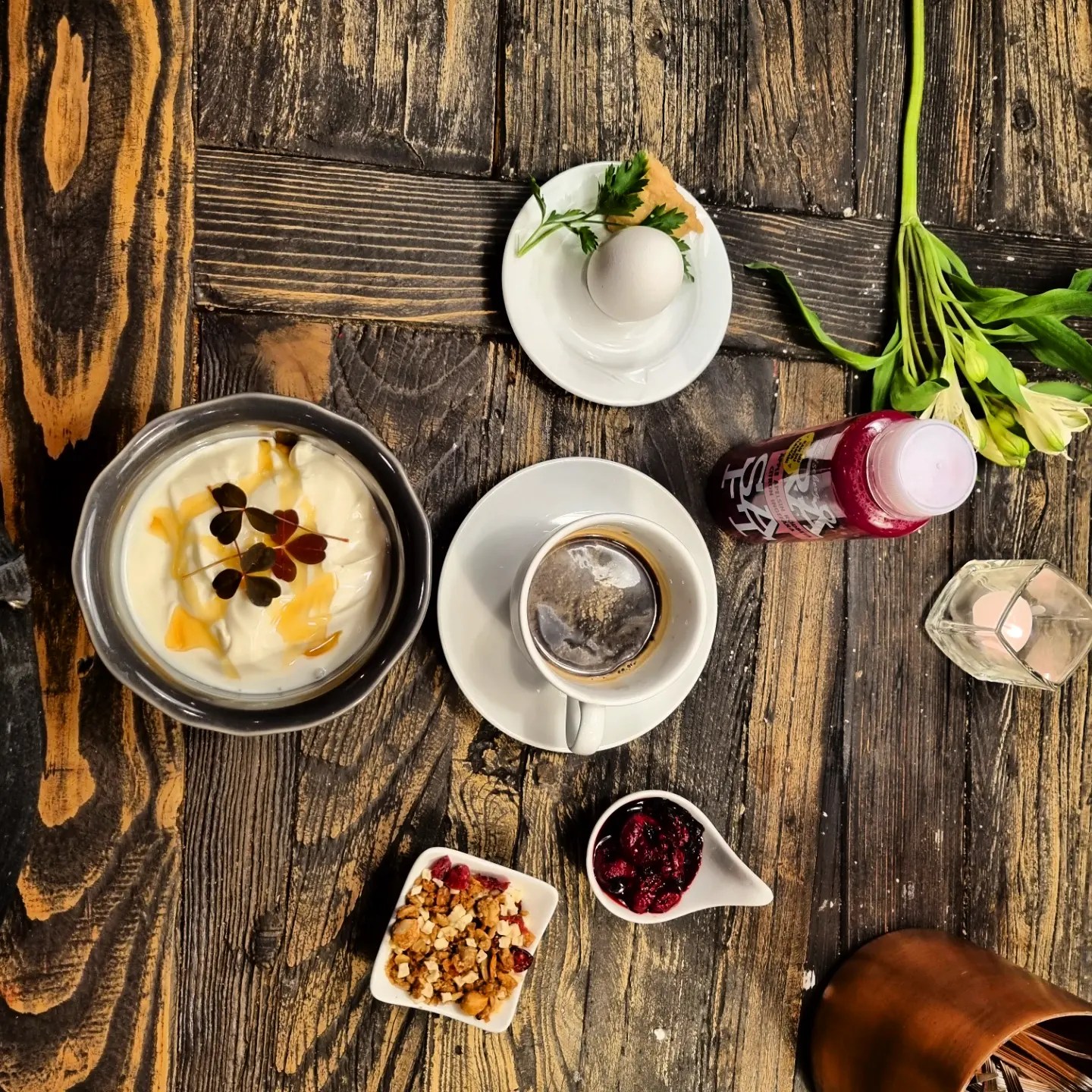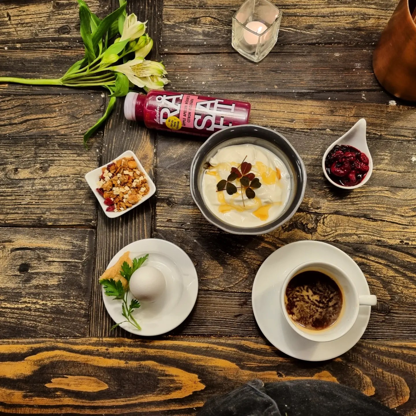 En bra frukoststart med en dubbelespresso, turkisk yoghurt med granola och honung som toppas med oxalis, alltid nykokt ägg med kaviar med färska kryddor samt något svalkande från Loviseberg råsaft som har en sak gemensamt, de är gjorda av helt färska frukter och grönsaker. Alla drycker är helt obehandlad vilket gör att massor av nyttiga vitaminer, mineraler och levande enzymer finns kvar i juicen.