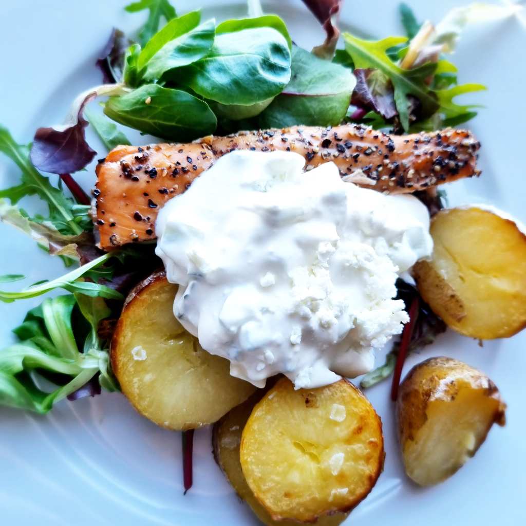 Ugnsbakade potatishalvor med flingsalt, varmrökt svartpeppar lax och tzatziki med fetaost utan vitlök.