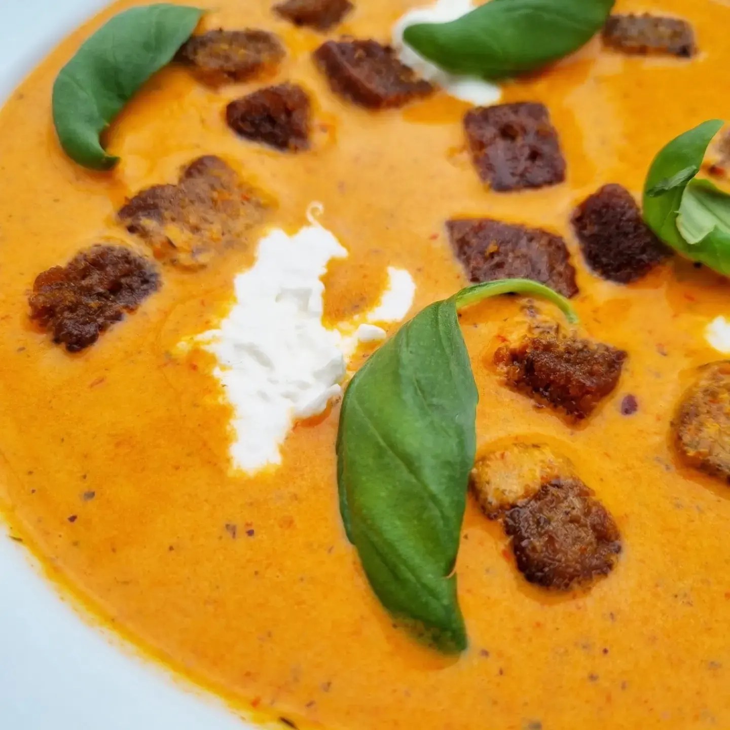 Toppa med krutonger, stracciatella och basilika. Går självfallet bra med fetaost eller något annat du själv tror passa.
