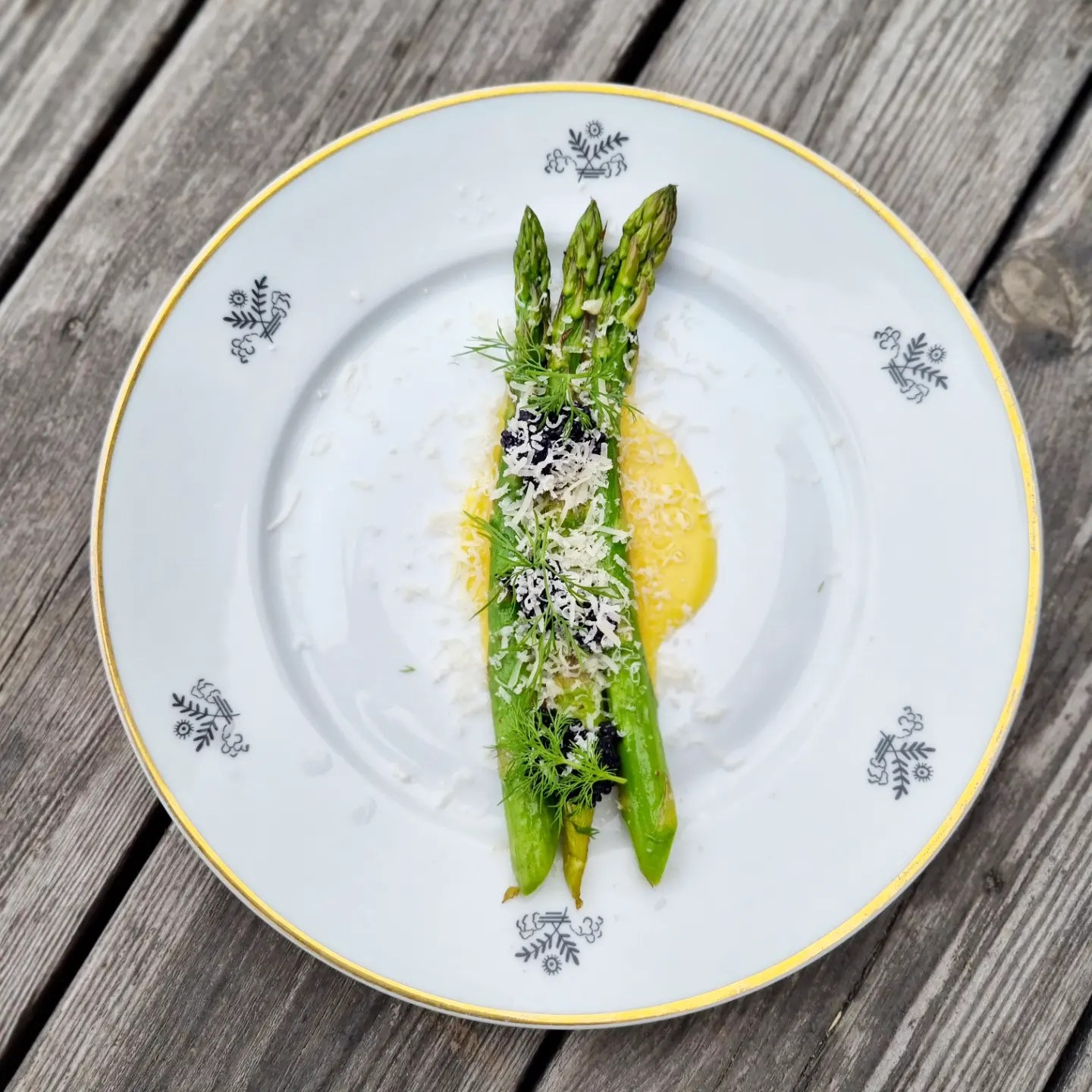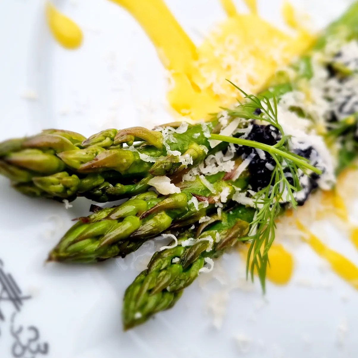En riktigt härlig vårrätt tillsammans med ett smaksatt vatten är smörstekt sparris med hollandaisesås med extra citronsaft, svart caviar och riven grandpandao. Det går inte att äta för mycket?