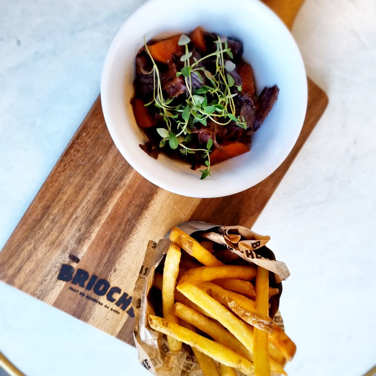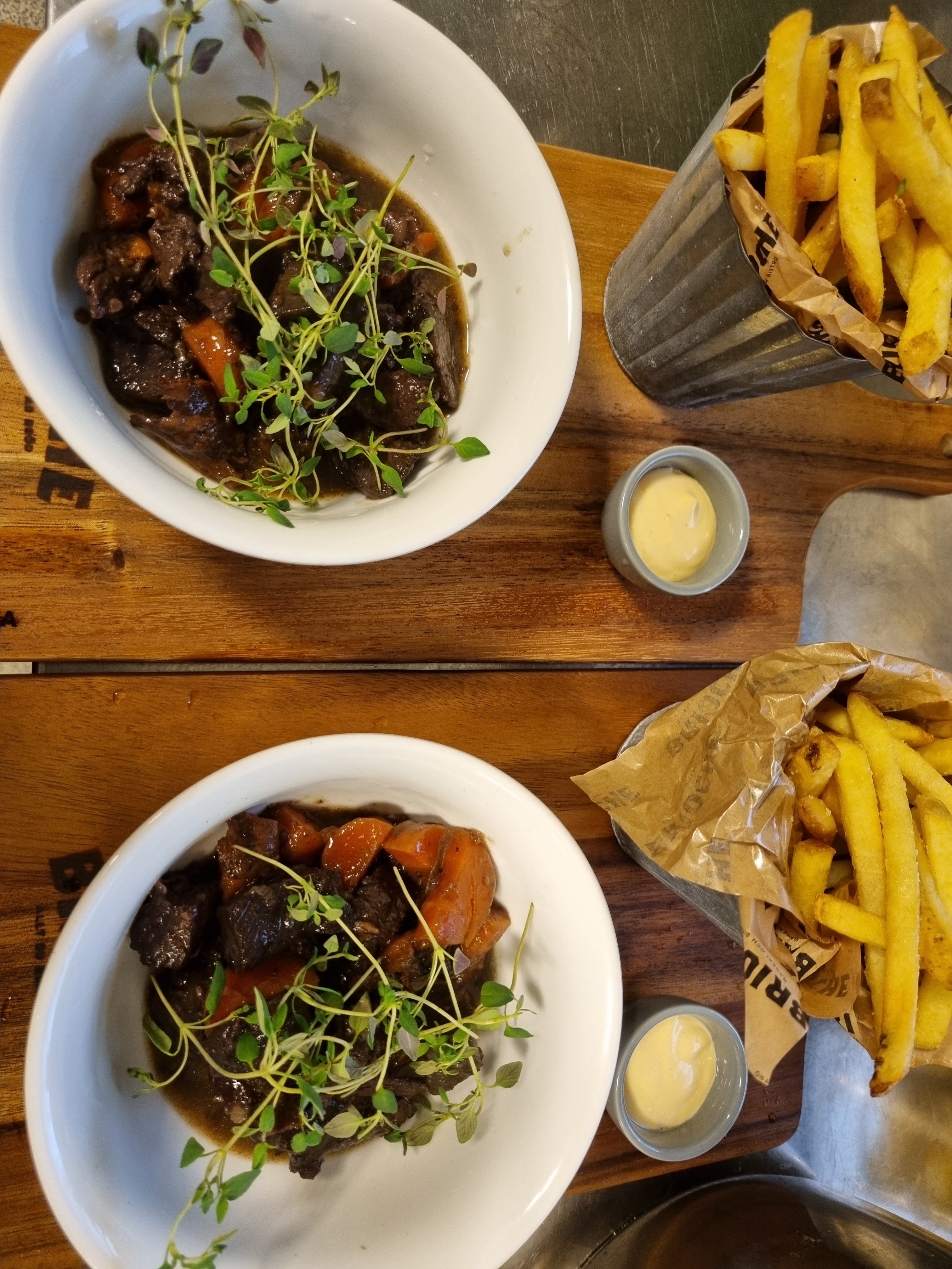Det blev nötgryta som har fått koka i vin, schalottenlök, timjan, salt, peppar och morötter som har fått rosta i ugnen. Till detta serveras vår egen majonnäs samt fries, bröd och kaffe efter maten.