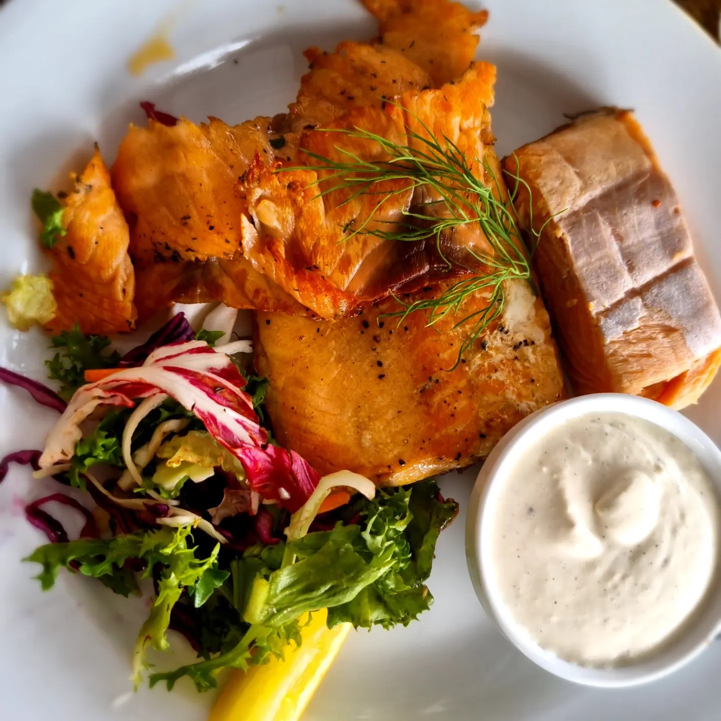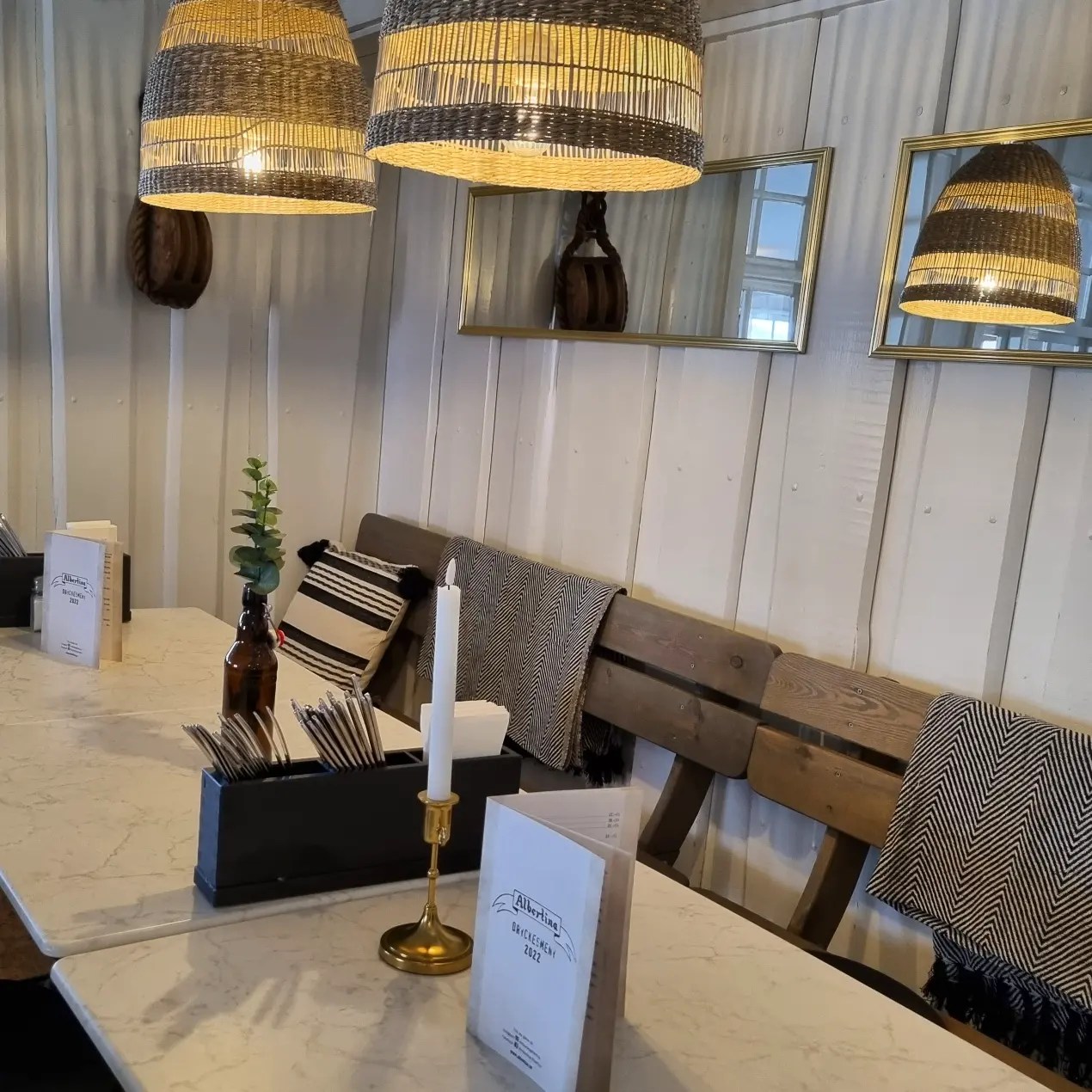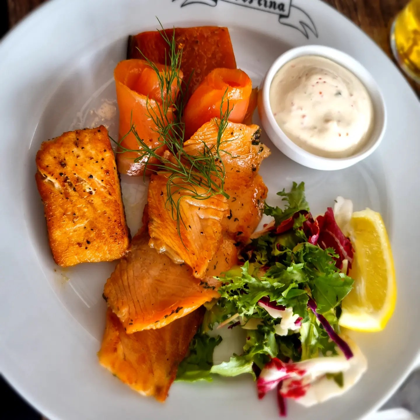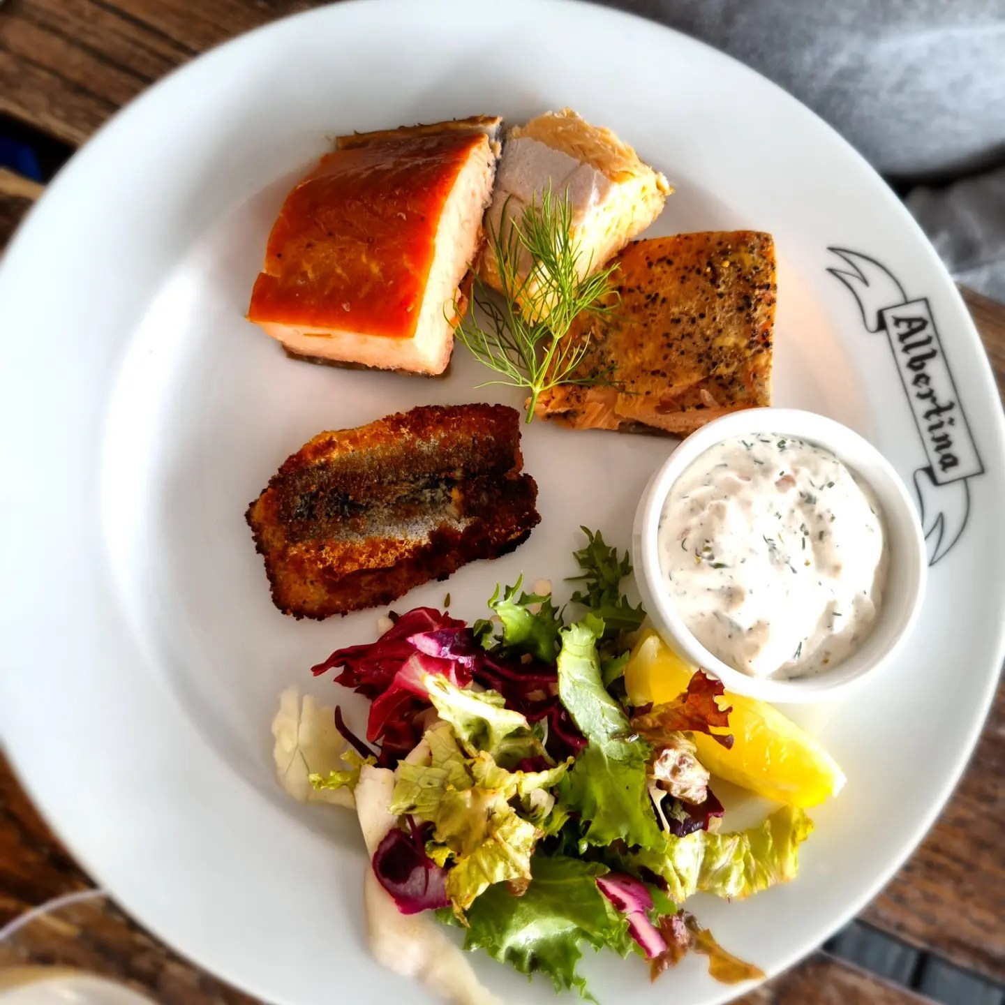 Sedan 1980 har Albertina serverat nöjda och glada matgäster. Här erbjuds det fisk, barnmeny, kött och drycker från lokalt och större import. Dock förvånas jag över uppläggningen och valet av sallad utan dressing av något passande slag till fisk samt den torftiga dillkvisten.