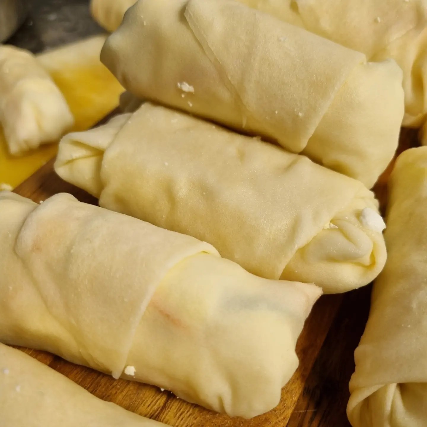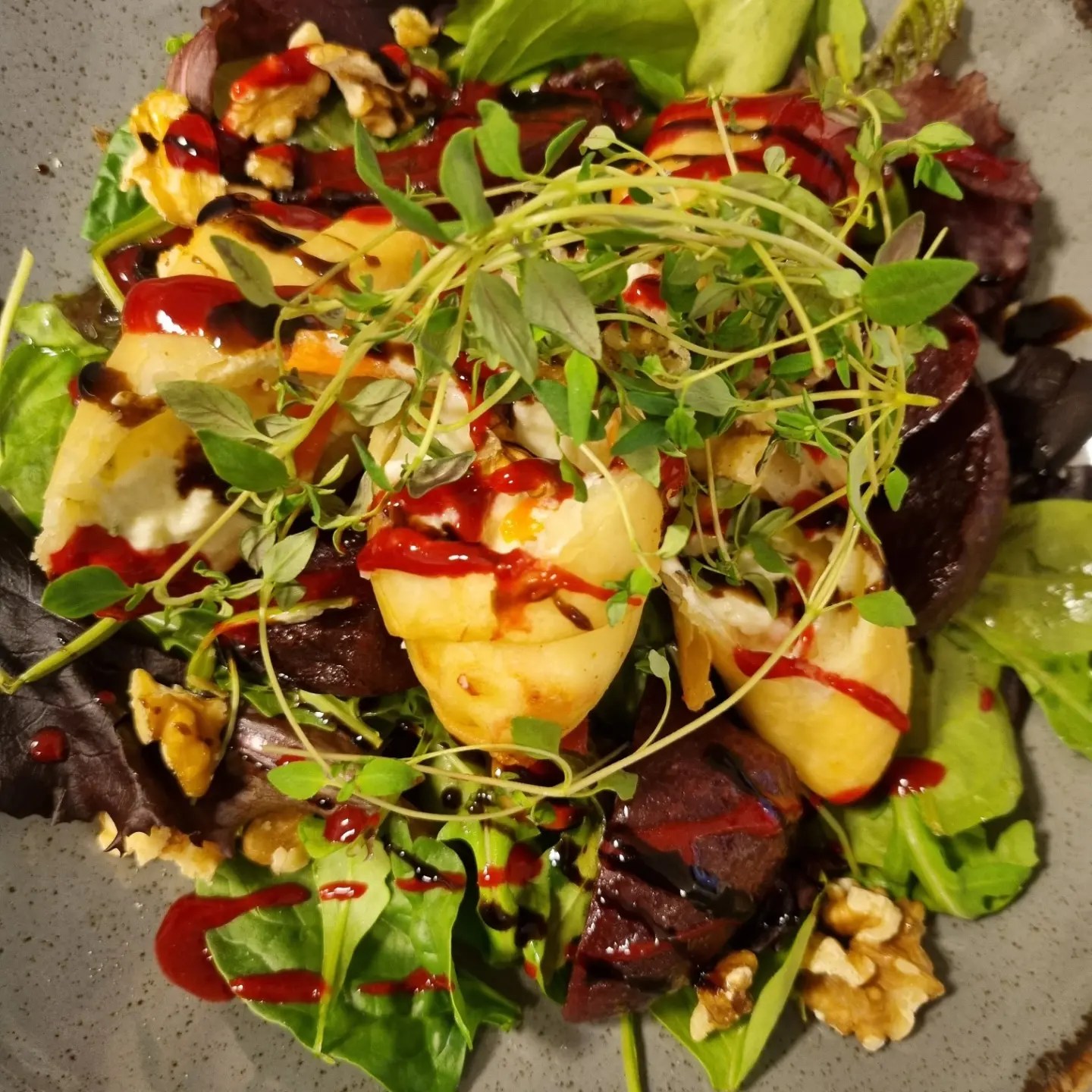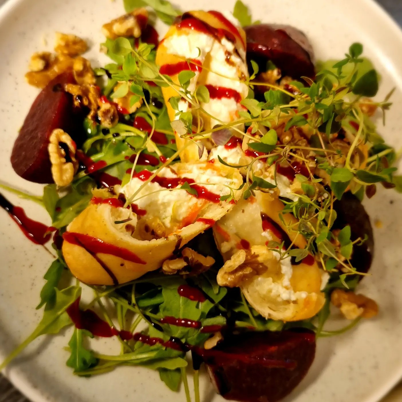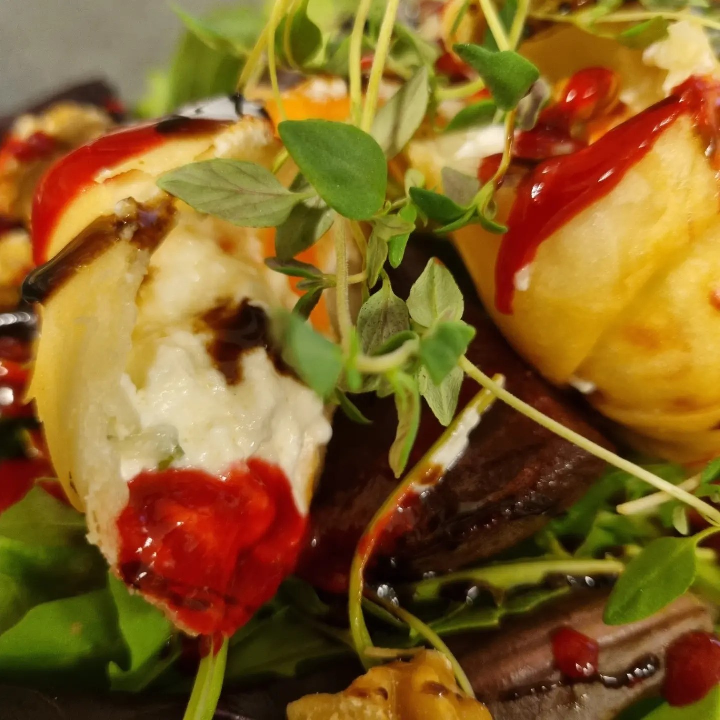 Vad äter vi till lunch? Friterade fetaostknyten fylld med strimlad morot och purjo. Serveras med rödbetor brynt i smör, sallad, valnötter och hallonbalsamicocoullis som toppas med timjan. Till detta slappnar vi av med ett glas rosé eller ett glas bubbel och låtsas vi är utomlands. Då är det mesta tillåtet oavsett tidpunkt.