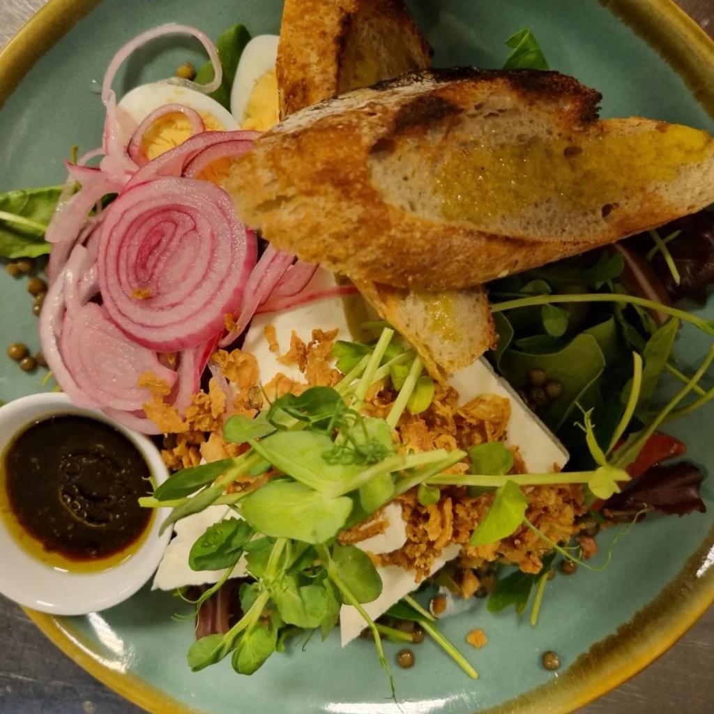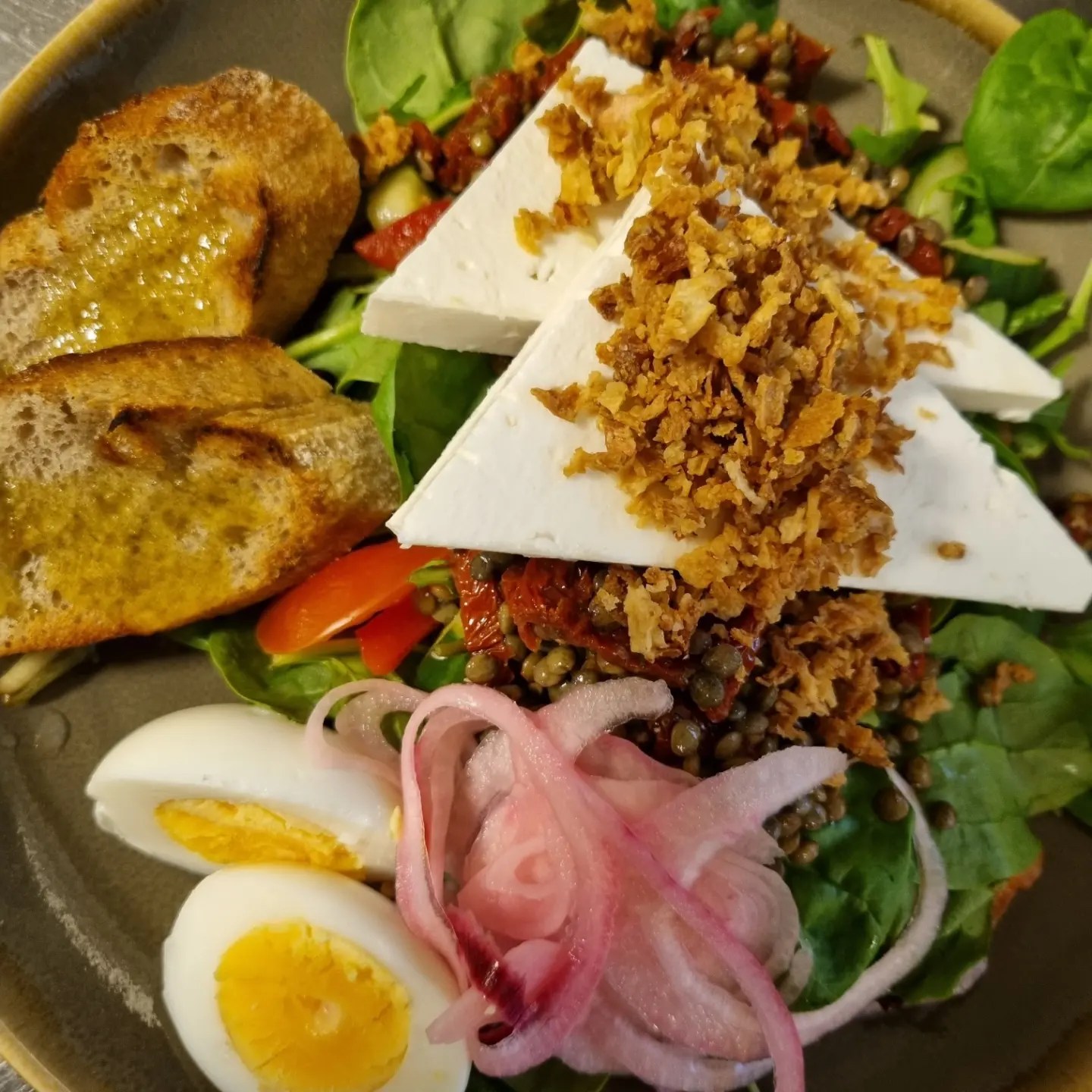 En riktigt god och mättande sommarsallad på gröna Puylinser som har sitt ursprung i den franska regionen Le Puy och är odlade på vulkanisk mark som ger en speciell färg och smak. Håller extremt bra vid kokning. Detta blandas med soltorkade tomater, vitlök och oregano som serveras med fetaost, inlagd rödlök, rostad lök, kokt ägg och vinegrette tillsammans med nybakat vitlöksbröd.