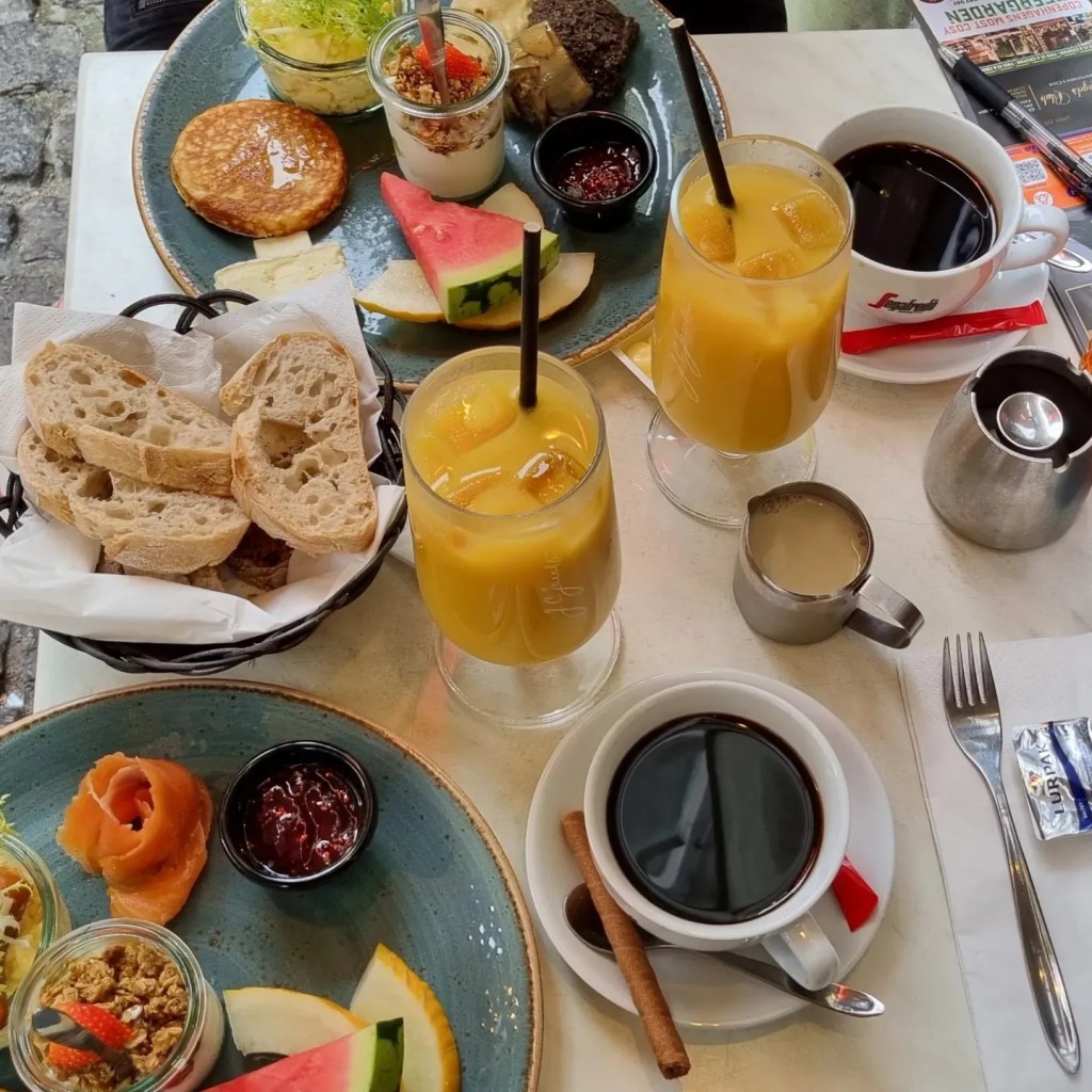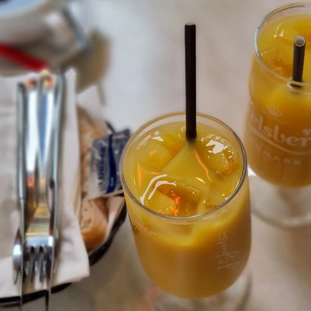 Till detta väljer du valfri kaff men var tydlig med om ni önskar stort eller litet glas till juice och andra drycker. Min apelsinjuice kostade 60 pix i danska pengar vilket är 84 svenska.