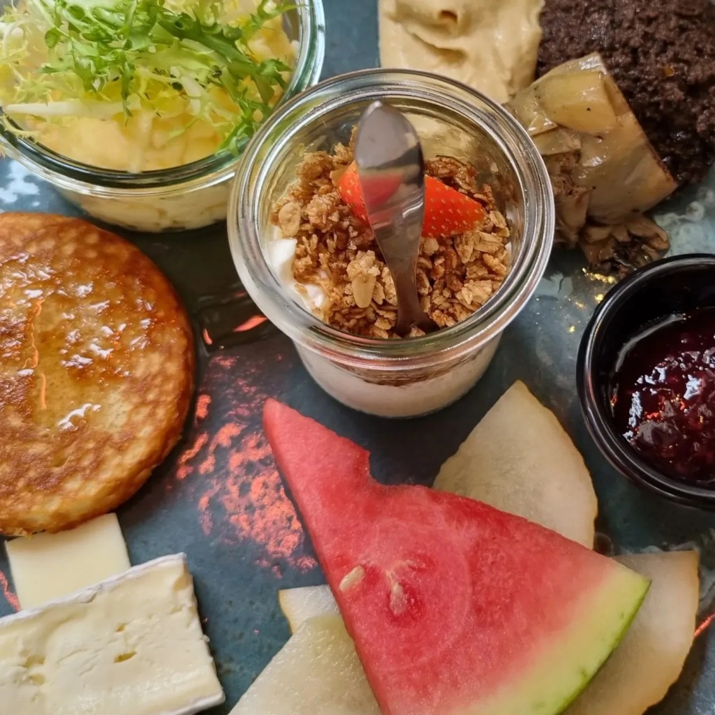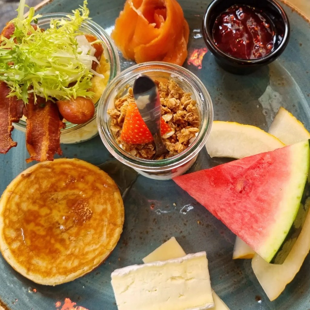 Frukosterbjudande på nästan alla ställen är så fantastiska. Jag tog ett frukostpaket som bestod av äggröra, bacon, korv i små söta skålar, yoghurt och granola med honung i en ännu mindre skål, rikligt med bröd, smör, brieost, gouda och 1 amerikansk pankaka med sylt i skål.